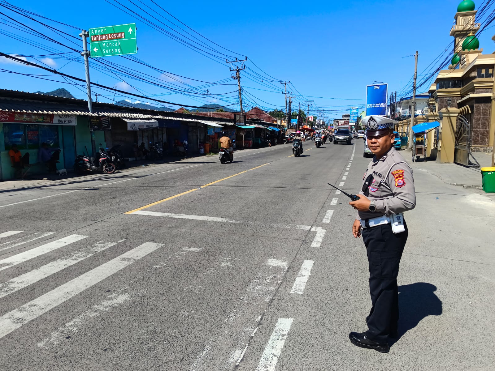 Cilegon - Pelayanan Kepada Warga Masyarakat dan Guna menciptakan situasi lalu lintas yang aman, tertib dan lancar, Personel Polsek Anyar Polres Cilegon Polda Banten secara rutin melaksanakan pengaturan lalu lintas di Simpang Puskesmas Anyar Jl. Raya Anyar-Cinangka, Minggu (18/05).