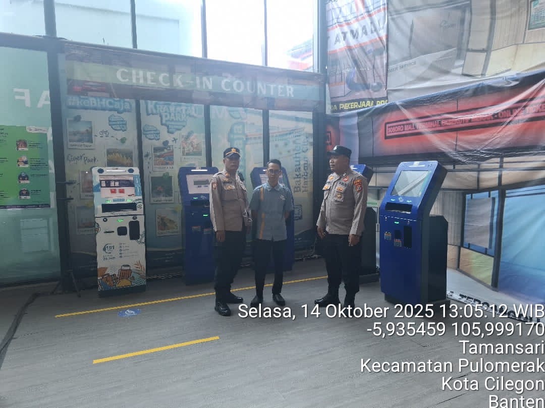 Cilegon - Personel Polsek Kskp Merak Polres Cilegon Polda Banten melaksanakan sambang dan patroli kawasan pelabuhan merak dalam rangka menjaga Harkamtibmas di Kawasan Pelabuhan Merak, Selasa (14/10/2025).