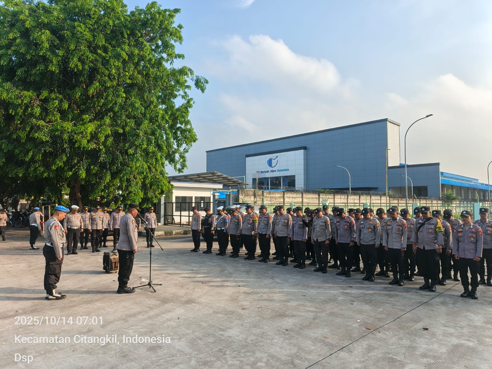 Cilegon -  Kapolsek Ciwandan KOMPOL Andi Suherman Pimpin Apel pengamanan aksi damai dari Serikat Pekerja FSPMI Kota Cilegon ke PT. KNSS Cilegon pada Selasa, (14/10/2025).