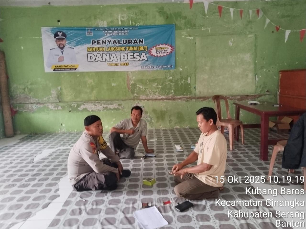 *CILEGON* dalam Rangka Mengantisipasi Gktm di wilayah Personil Bhabinkamtibmas Cinangka melakukan patroli Dialogis dengan Kepala Desa dan warga dan Menanyakan situasi Kamtibmas di wilayah dalam Rangka Menjaga Harkamtibmas di Desa Binaannya Kecamatan Cinangka Kab. Serang. Rabu (15/10/2025).