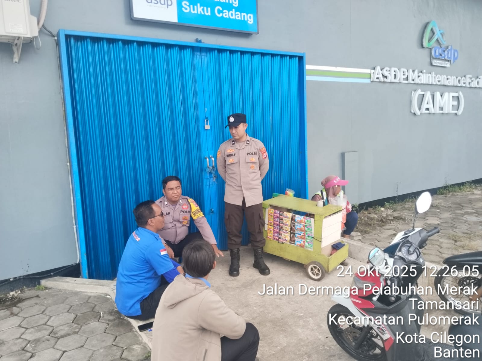 Cilegon - Personel Polsek Kskp Merak Polres Cilegon Polda Banten melaksanakan sambang dan patroli kawasan pelabuhan merak dalam rangka menjaga Harkamtibmas di Kawasan Pelabuhan Merak, Jumat (24/10/2025).
