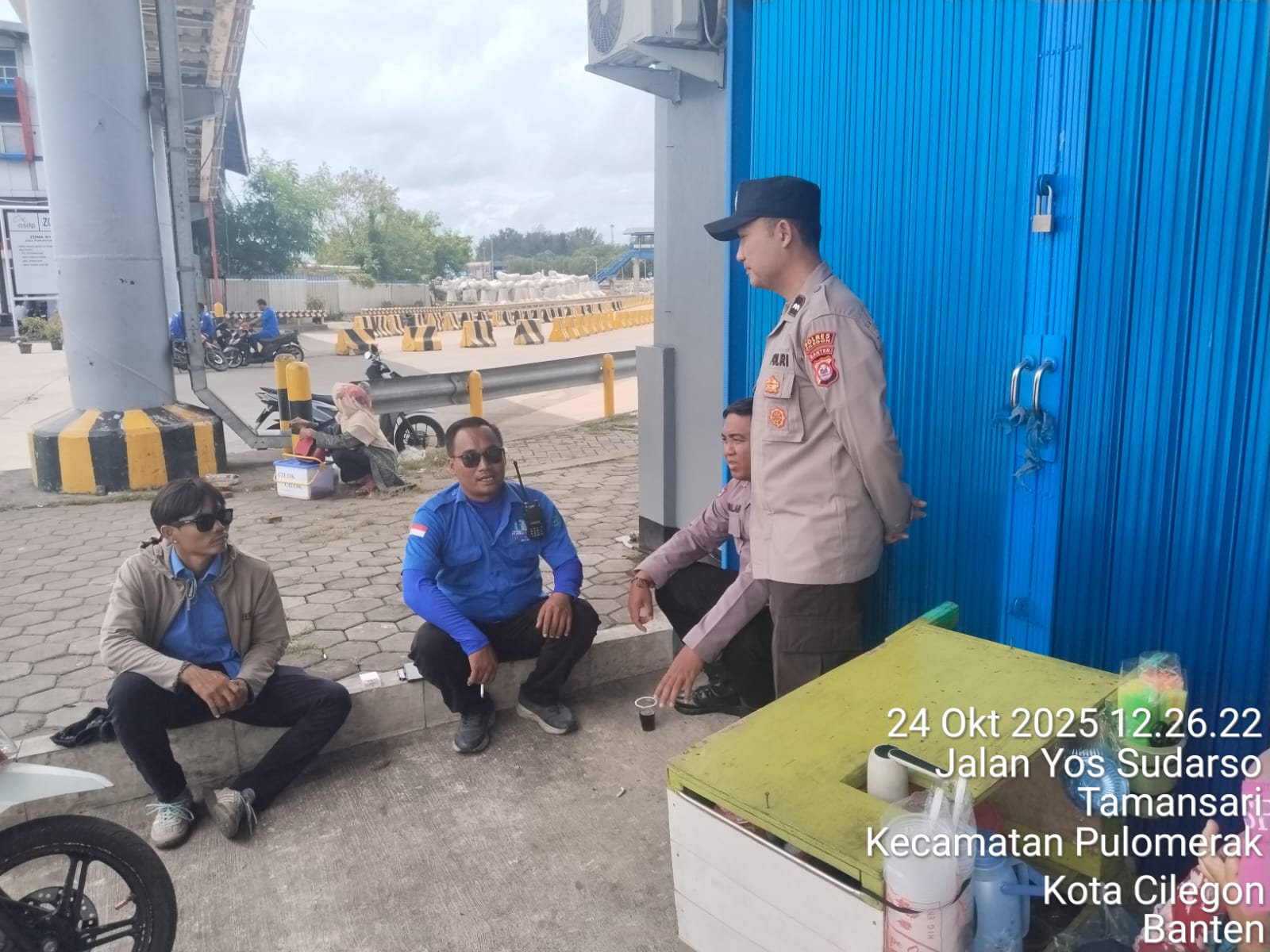 Cilegon - Personel Polsek Kskp Merak Polres Cilegon Polda Banten melaksanakan sambang dan patroli kawasan pelabuhan merak dalam rangka menjaga Harkamtibmas di Kawasan Pelabuhan Merak, Jumat (24/10/2025).