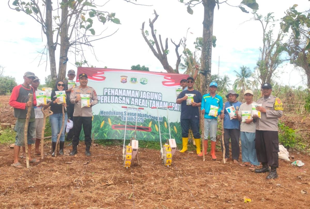 Kapolres Cilegon AKBP AKBP Dr. Martua Raja Taripar Laut Silitonga Melalui Kapolsek Anyar Polres Cilegon IPTU Iwan Sofiyan di  Kp. Cikoneng Desa Cikoneng Kecamatan Anyar Kab Serang Dilaksanakan dan mengikuti  Kegiatan Penanaman Jagung yang dilaksanakan Oleh Desa Cikoneng Pada perluasan Area Tanam dalam Rangka Mendukung Swasembada Pangan 2025 Serta Implementasi Program Prioritas Asta Cinta Presiden Republik Indonesia