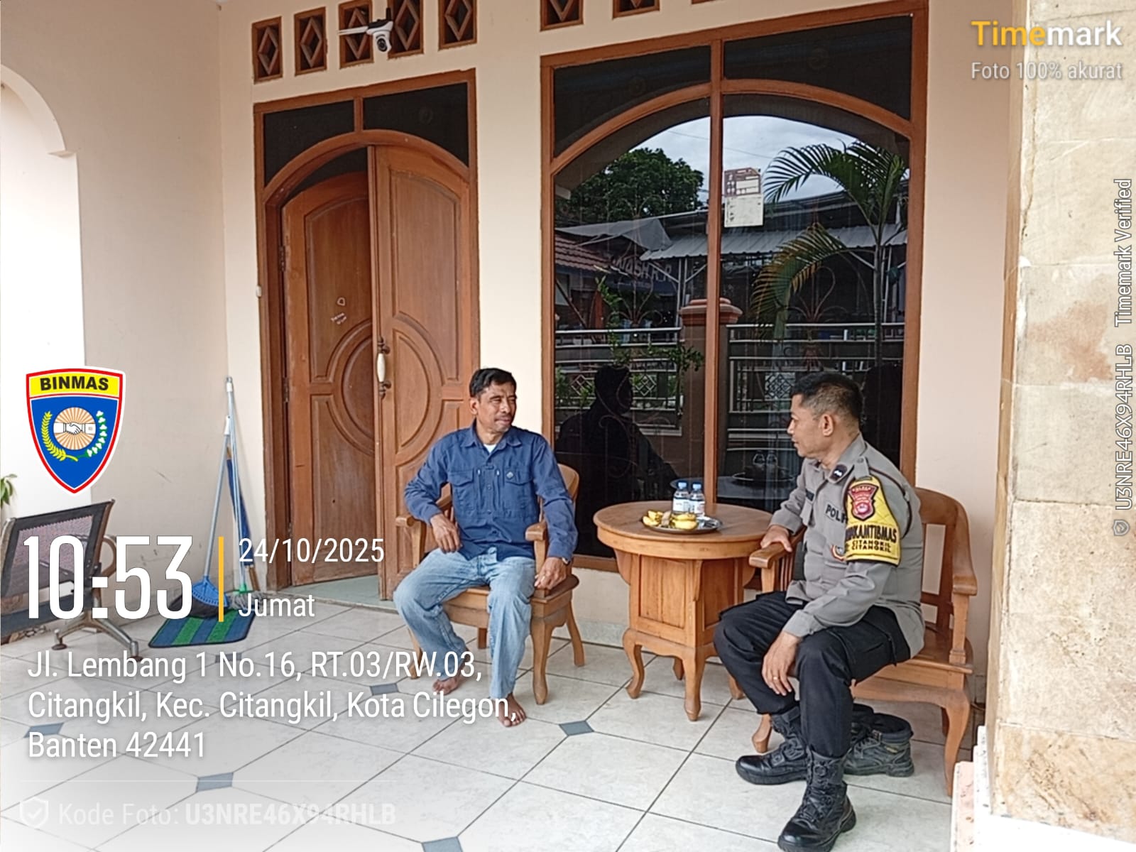Cilegon - Bhabinkamtibmas Polsek Ciwandan Polres Cilegon Polda Banten Melaksanakan kegiatan Dialogis/Sambang Door to Door Sistem (DDS) Di daerah binaannya serta memberikan Pesan-pesan Kamtibmas Guna Menciptakan situasi Harkamtibmas yang Aman dan nyaman, Sabtu (25/10/2025).