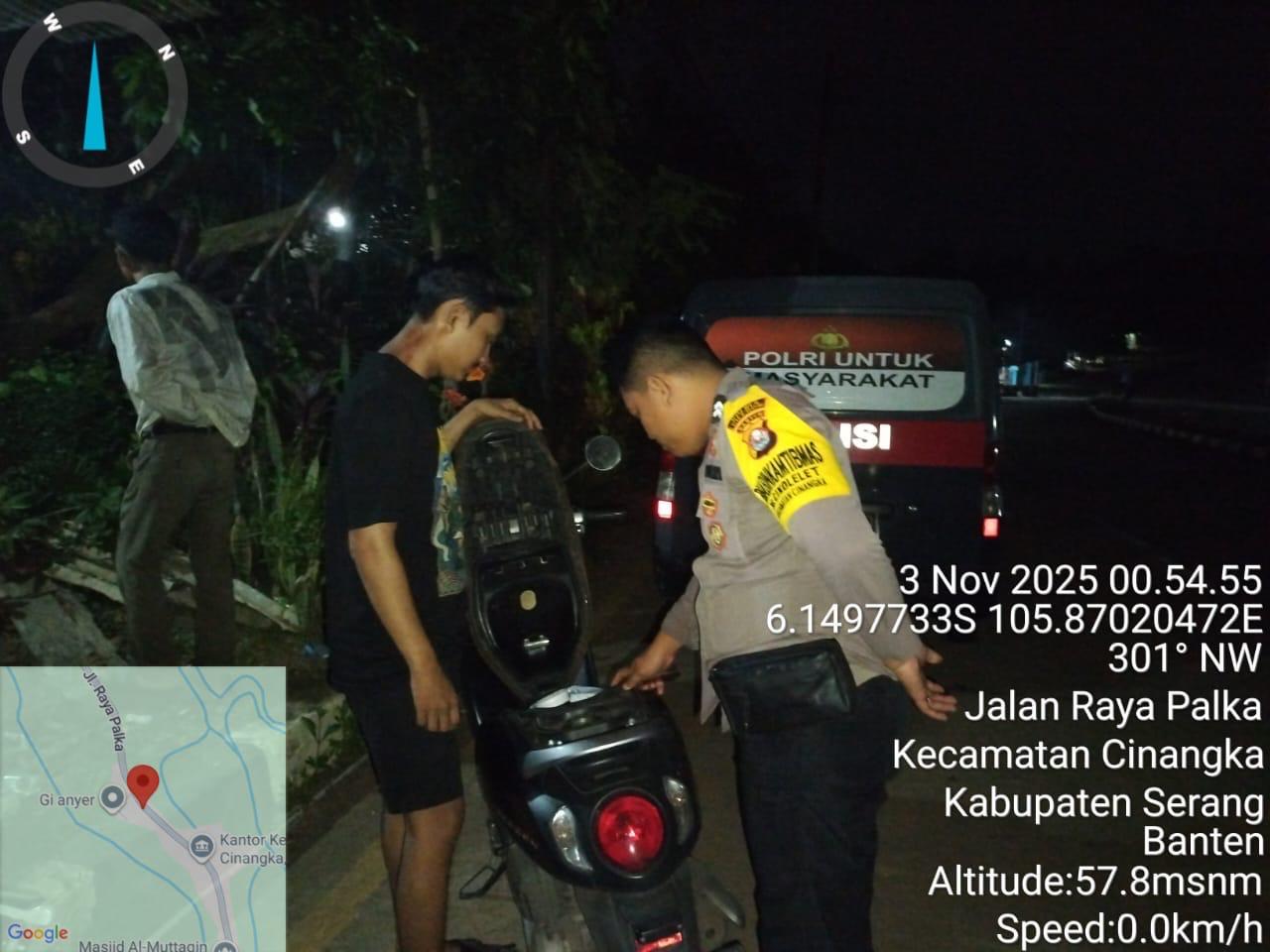 *Cilegon* – Dalam Rangka Pencegahan Kejahatan Jalanan dan Memelihara situasi keamanan dan menjaga serta memberikan rasa aman dan nyaman di masyarakat,Salah satu upaya untuk mewujudkan hal tersebut sebagaimana yang dilakukan oleh Personil Polsek Cinangka Polres Cilegon Polda Banten melaksanakan giat patroli blue light malam hari hingga menjelang pagi, Senin (03/11/2025).