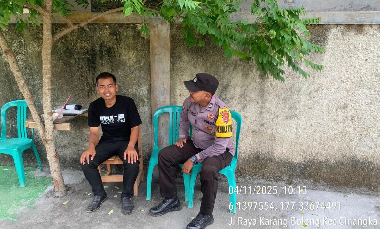 *CILEGON* dalam Rangka Mengantisipasi Gktm di wilayah Personil Bhabinkamtibmas Cinangka melaksanakan patroli Dialogis dengan Kepala Desa dan warga dan Menanyakan situasi Kamtibmas di wilayah dalam Rangka Menjaga Harkamtibmas di Desa Binaannya Kecamatan Cinangka Kab. Serang. Selasa.(04/11/2025).