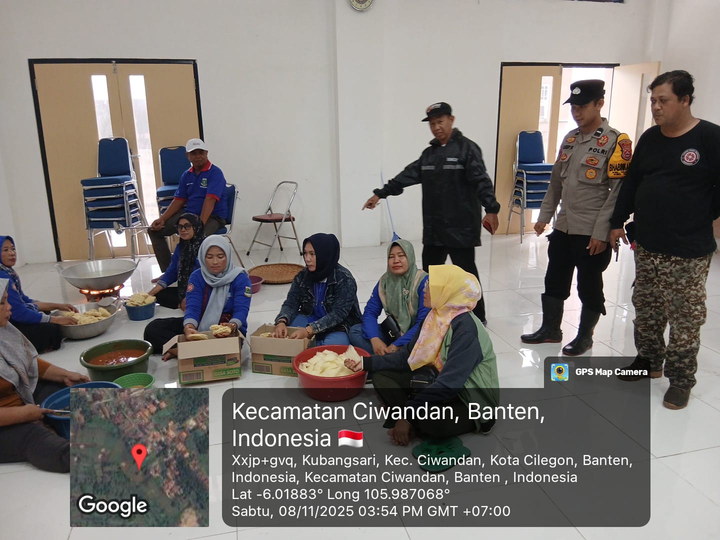 Cilegon - Bhabinkamtibmas Dan Lurah Kubangsari Mengecek Dapur Umum untuk Masyarakat Yang Terdampak Genangan Air pukul 16.07 WIB di lingkungan Cigading pasar Rt 01/02 Kelurahan Kubangsari Kecamatan Ciwandan, Sabtu (08/11/2025).