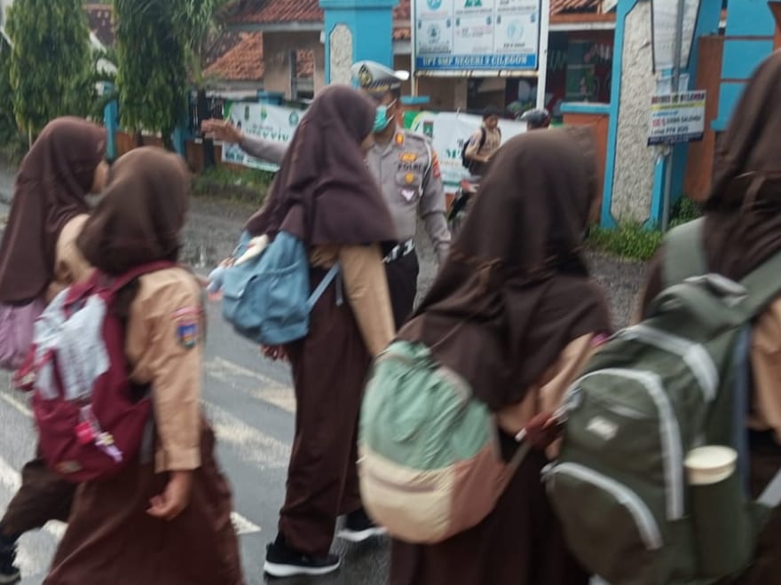 Meskipun saat hujan !!! Kanit Lantas Polsek Pulomerak Bantu atur lalin di depan SMP 3 Cilegon