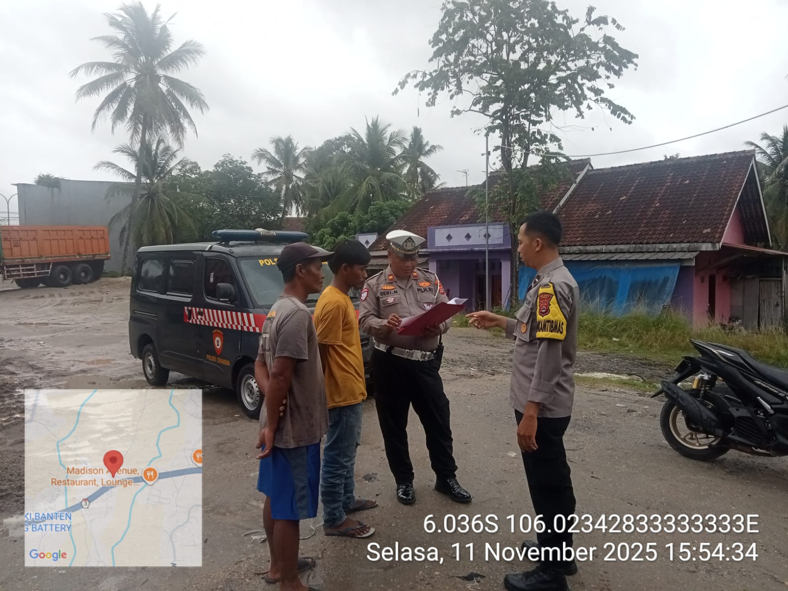 Cilegon - Panit Lantas Polsek Ciwandan IPTU Deni Mulyana dan Bhabinkamtibmas Kelurahan Tamanbaru AIPDA Ediyanto melaksanakan monitoring stokfile pasir di Lingkungan Kubang Lesung Pabuaran PT. Pamungkas Perkasa, Kelurahan Tamanbaru, Kecamatan Citangkil, Kota Cilegon, Selasa (11/11/2025).