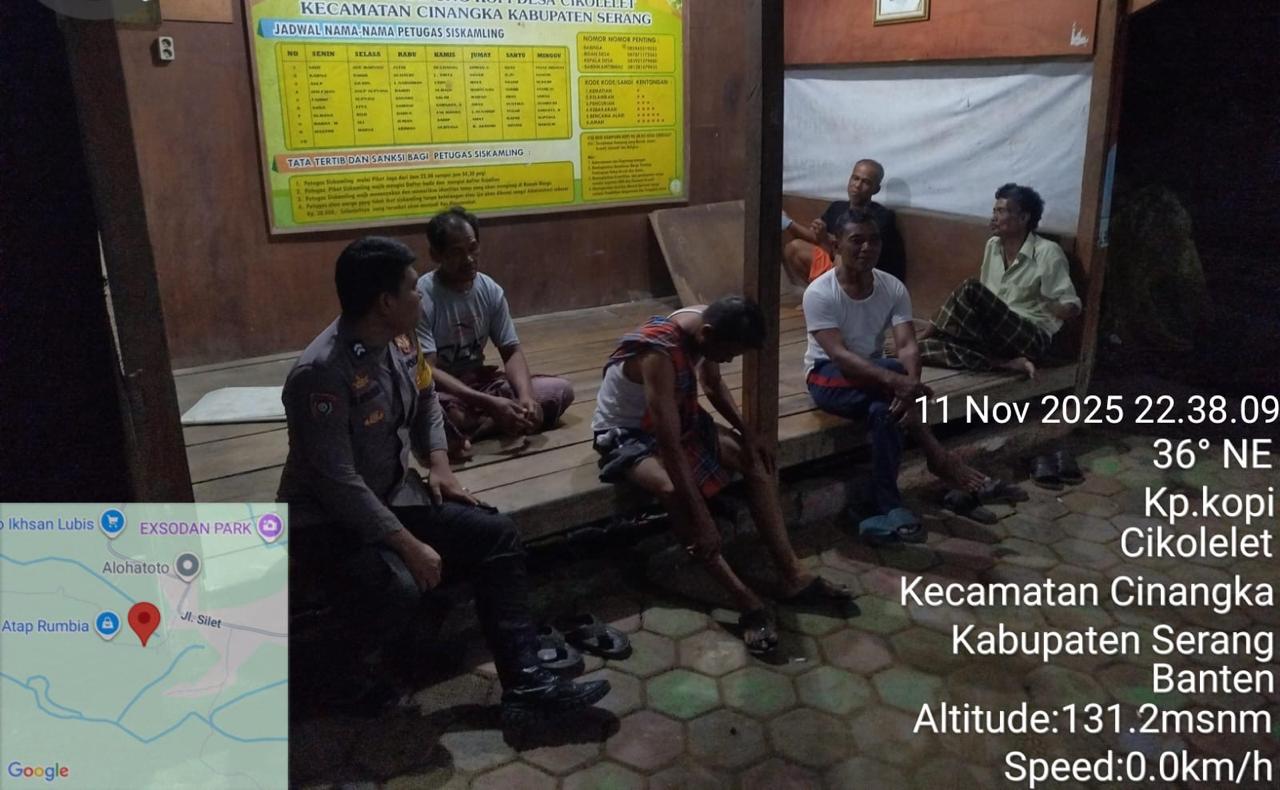 *Polres Cilegon* || Personil Bhabinkamtibmas Polsek Cinangka melaksanakan Program Komandan Wish Kapolda Banten RONDA SATKAMLING menyampaikan komunikasi dengan Petugas Siskamling agar berperan aktif dalam menciptakan Harkamtibmas yang aman dan Kondusif, Rabu (12/11/2025).