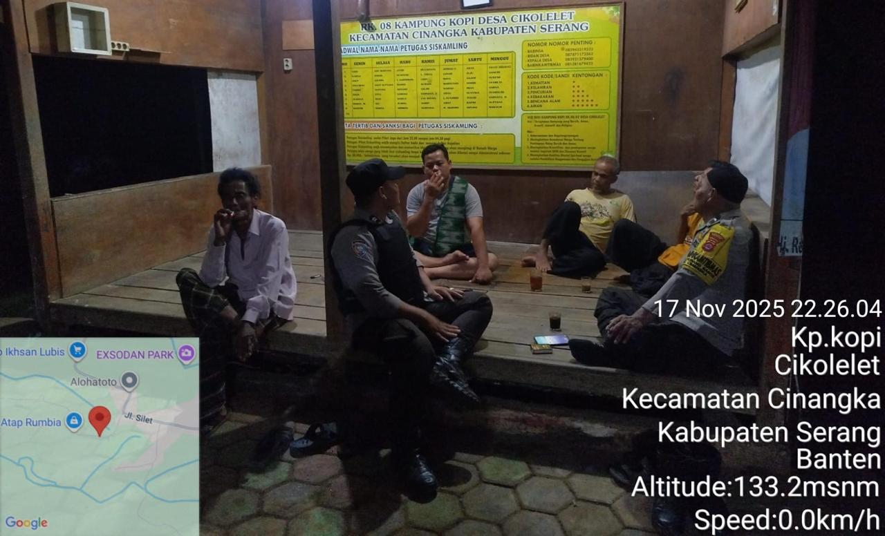 *Polres Cilegon* || Personel Bhabinkamtibmas Polsek Cinangka melaksanakan Program Komandan Wish Kapolda Banten RONDA SATKAMLING menyampaikan komunikasi dengan Petugas Siskamling agar berperan aktif dalam menciptakan Harkamtibmas yang aman dan Kondusif, Selasa (18/11/2025).