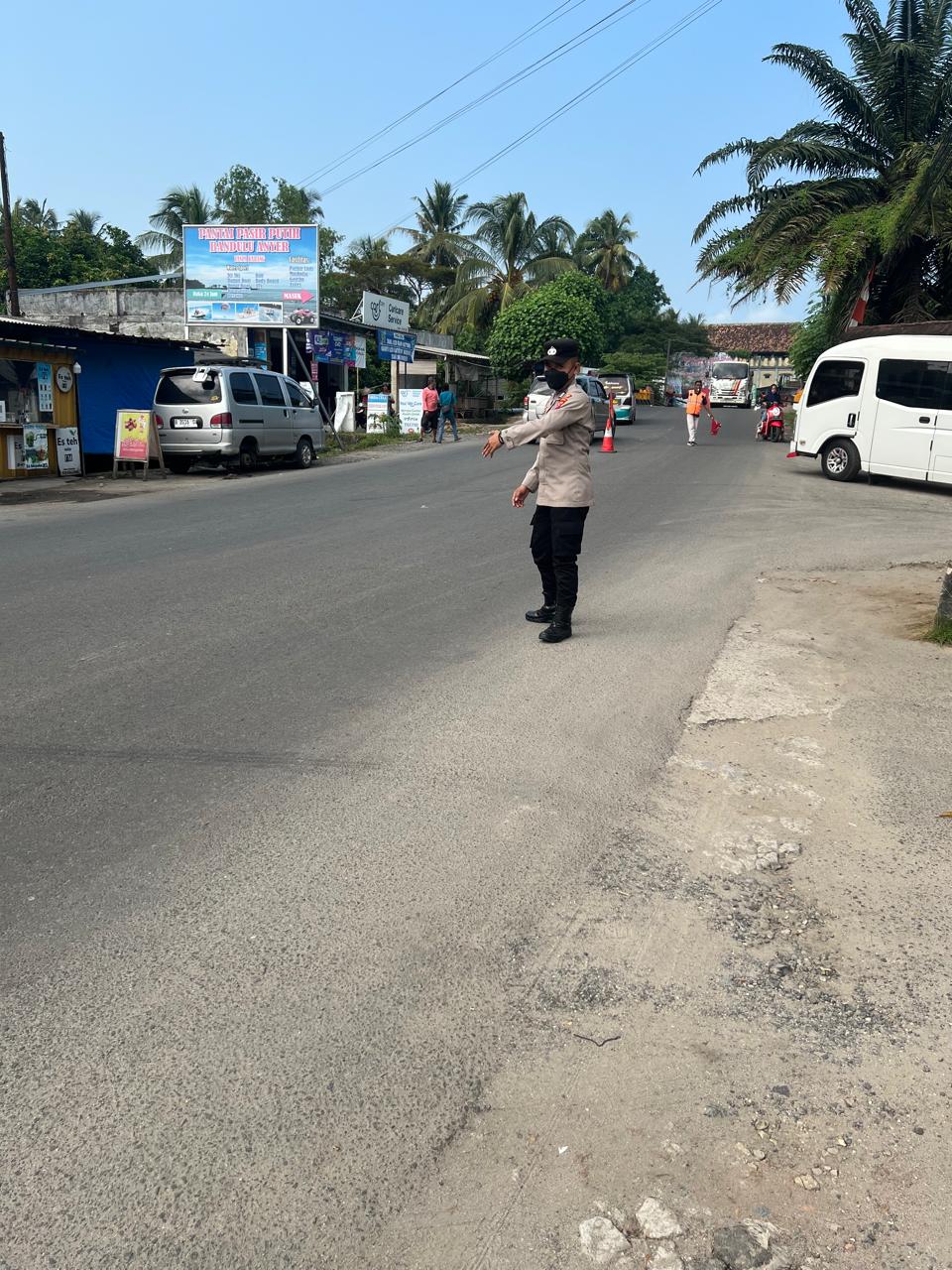 Anggota Siwas Polres Cilegon melaksanakan Pengaturan Arus Lalin atau Gatur Strong Point di arah jalur Wisata Pantai Anyer Banten.