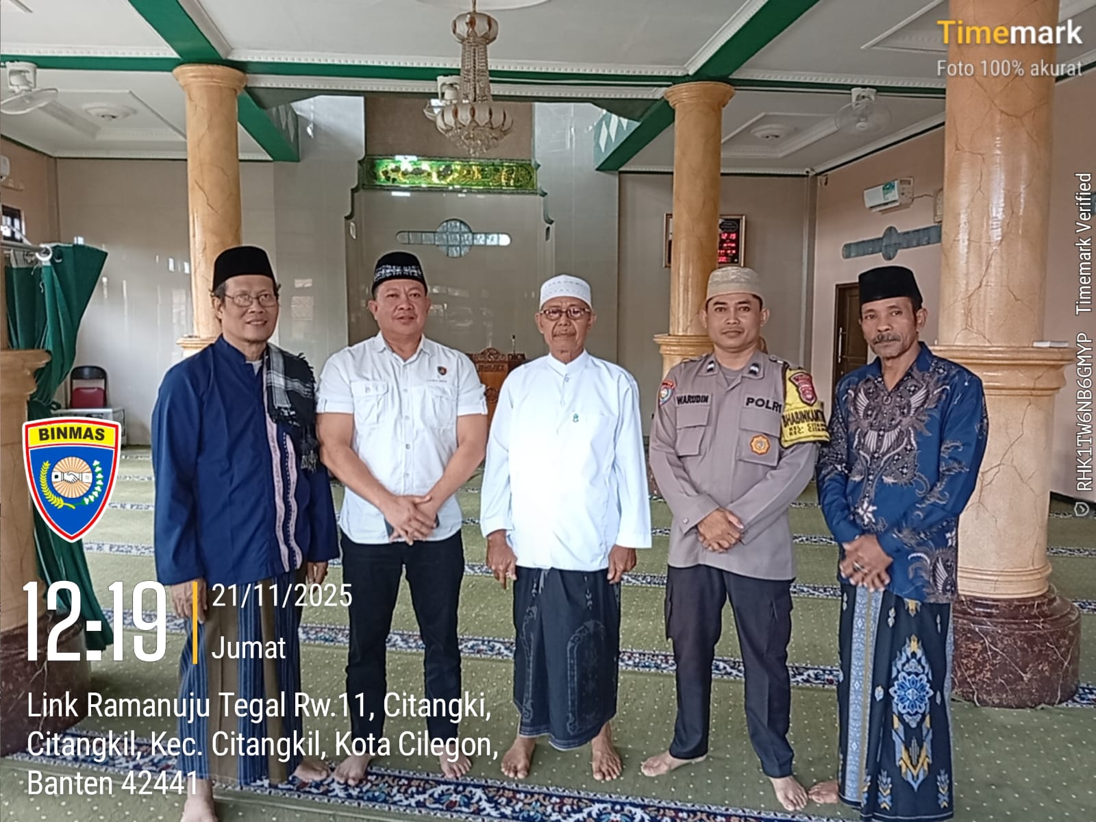Cilegon - Bhabinkamtibmas Polsek Ciwandan Polres Cilegon Polda Banten Selesai melaksanakan Sholat secara berjama’ah dan Sampaikan Himbauan-himbauan Kamtibmas Kepada Masyarakat Jama'ah Yang ada Dimasjid, Jum'at (21/11/2025).
