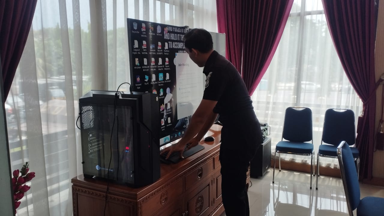 Anggota Tik Polres Cilegon Menyiapkan Sarana dan Prasarana Untuk Kegiatan Zoom meeting Dalam pelaksanaan kegiatan zoom meeting tersebut anggota TIK Polres Cilegon yang bertanggung jawab untuk menyiapkan peralatan zoom. Selain itu agar di tidak ada gangguan jaringan sebelum pelaksanaan anggota TIK melakukan pemeriksaan terhadap sarana dan prasarana tersebut . Satu jam sebelum kegiatan zoom meeting itu dimulai. Kapolres Cilegon AKBP. DR. MARTUA RAJA TARIPAR LAUT SILITONGA. melalui Kasi TIK IPTU Lukman menyampaikan bahwa “untuk menunjang kelancaran penyampaian informasi anggota TIk Polres Cilegon selalu memeriksa sarana dan prasarana tersebut, sebelum maupun pada saat pelaksanaan akan selalu di monitor