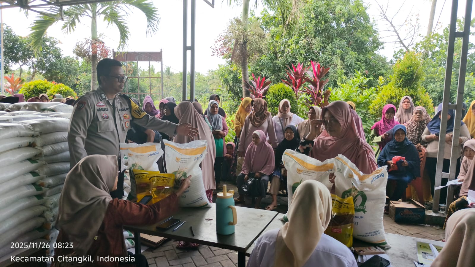 Cilegon -  Bhabinkamtibmas Kelurahan Samangraya Polsek Ciwandan Polres Cilegon Polda Banten BRIPKA Marisco melaksanakan pengawalan dan pendampingan dalam penyaluran Bantuan Pangan Pemerintah,Bantuan pangan di Kantor kelurahan Samangraya Kecamatan Citangkil Kota Cilegon, Rabu (26/11/2025).