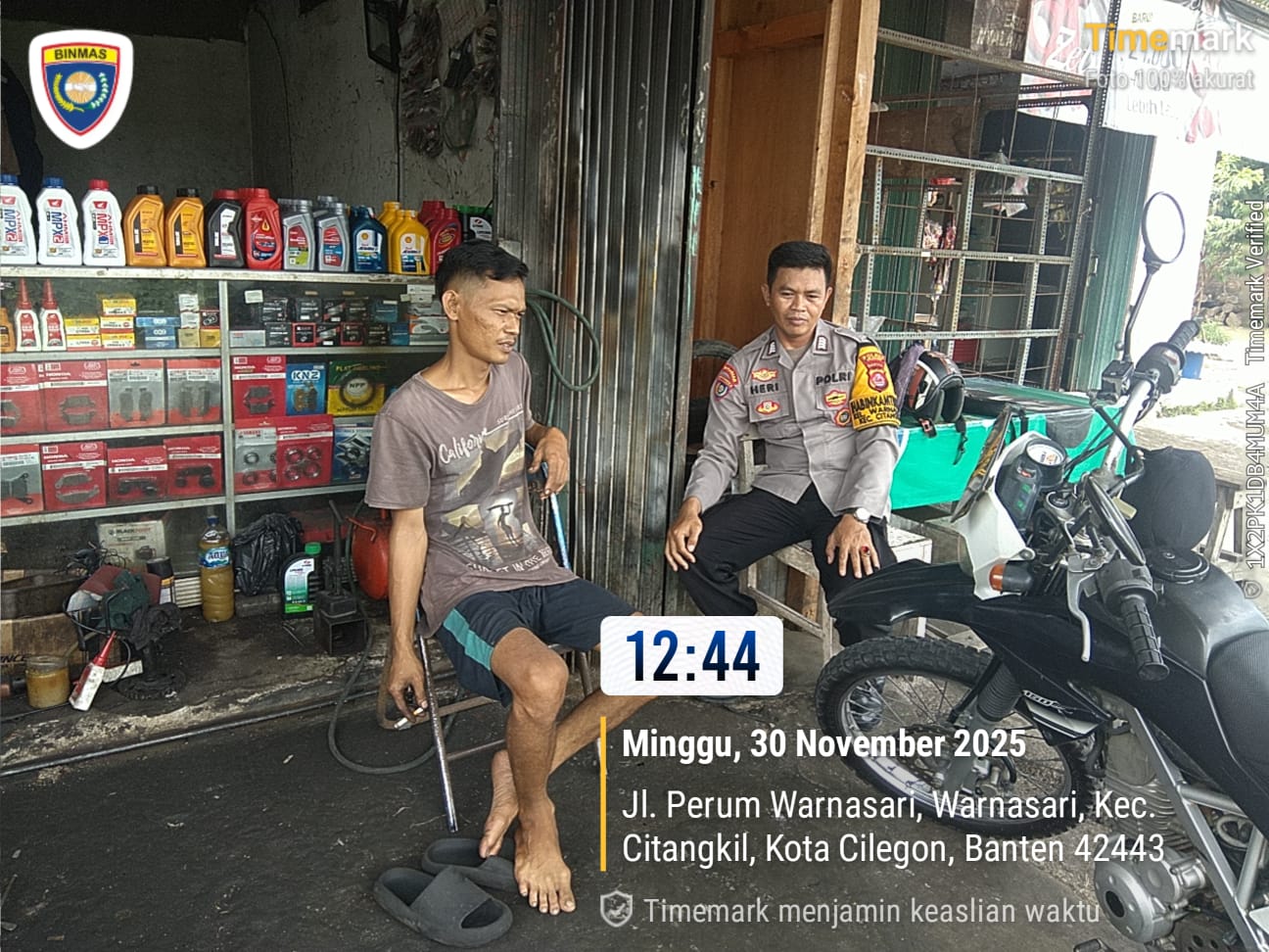 Cilegon - Bhabinkamtibmas Polsek Ciwandan Polres Cilegon Polda Banten melaksanakan Patroli Dan Sambang Kepada Pemilik Bengkel Di Lingkungan Daerah Binaannya, Minggu (30/11/2025).