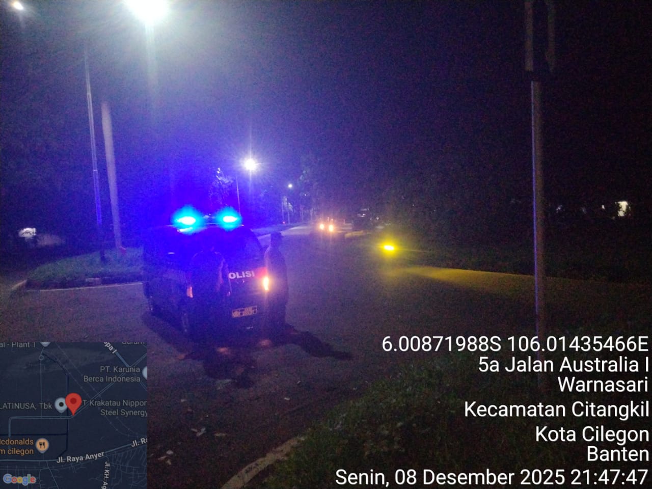 Cilegon - Personil Polsek Ciwandan Polres Cilegon Polda Banten Dalam Pelaksanaan Kegiatan Patroli dengan menyalakan lampu rotator berwarna biru di Daerah Hukum Polsek Ciwandan Polres Cilegon Polda Banten dari malam hingga dini hari, dalam rangka menciptakan situasi aman dan kondusif, Senin (08/12/2025).
