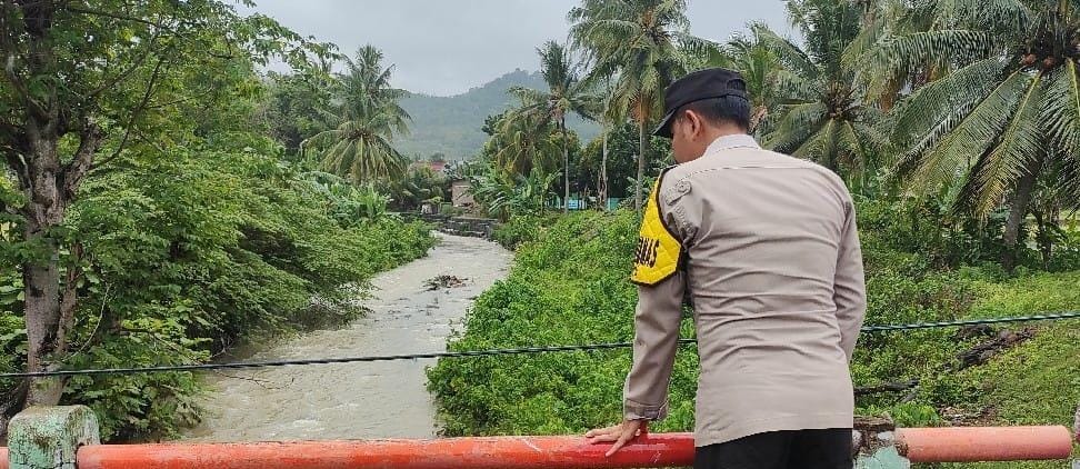 Personel Polsek Anyar Polres Cilegon Polda Banten melaksanakan Patroli kewilayahan mengecek debit air di Sungai pasca Hujan antisipasi banjir di wilayah Kec. Anyar, Selasa (09/12).