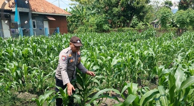 Personil Bhabinkamtibmas Polsek Purwakarta Aiptu Daryo.E melakukan pendampingan langsung bersama petani di wilayah kerjanya untuk memeriksa kondisi tanaman jagung yang sedang memasuki masa panen
