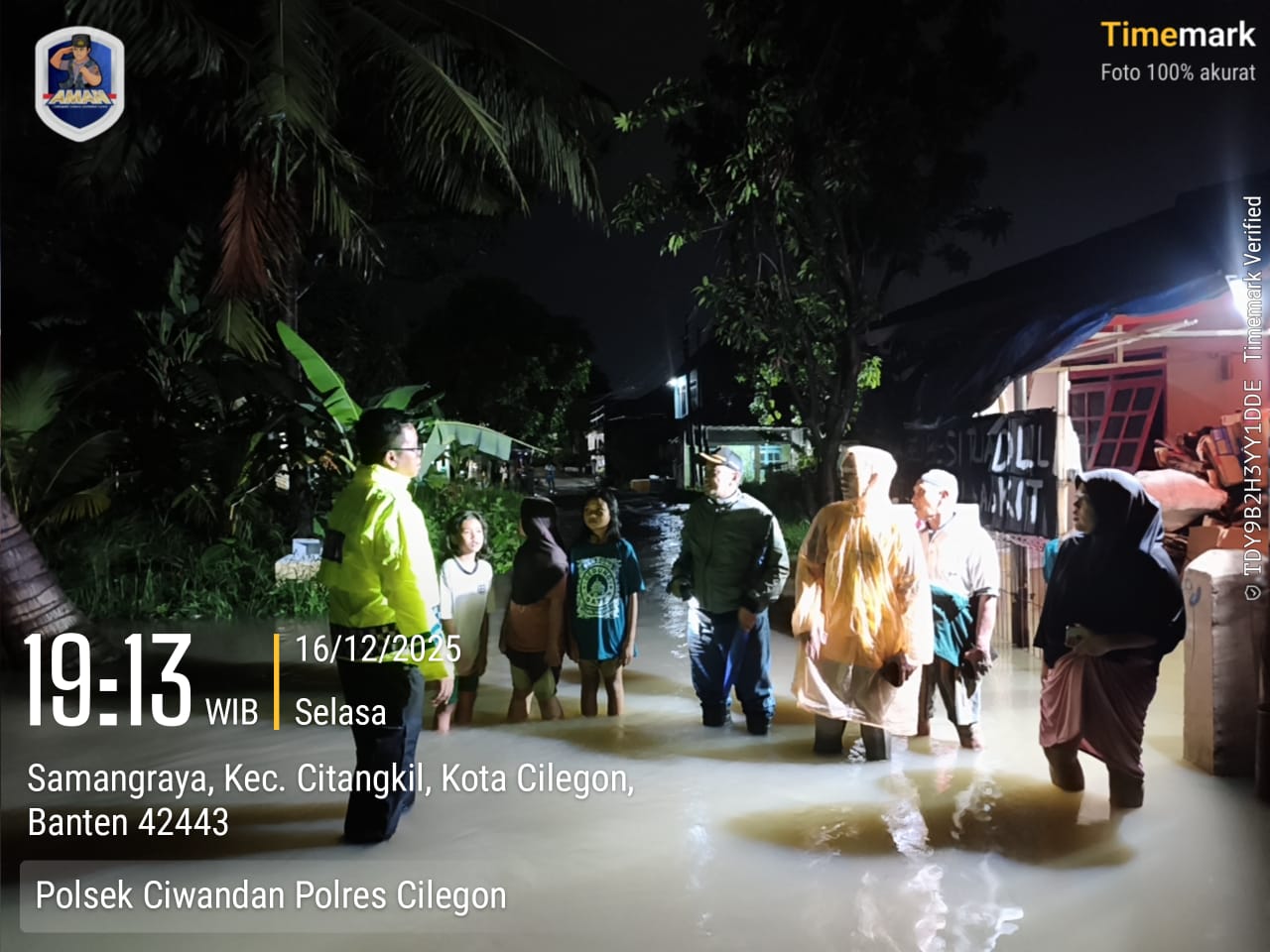 Cilegon - Bhabinkamtibmas Kelurahan Samangraya Polsek Ciwandan Polres Cilegon BRIPKA Marisco bersama Ketua Rt 01/02 dan Ketua Rw 02 Kel. Samangraya, melaksanakan monitoring wilayah pasca hujan lebat di Link. Warung Juet Rt 01/02 Kel. Samangraya Kec. Citangkil Kota Cilegon, Selasa (16/12/2025).