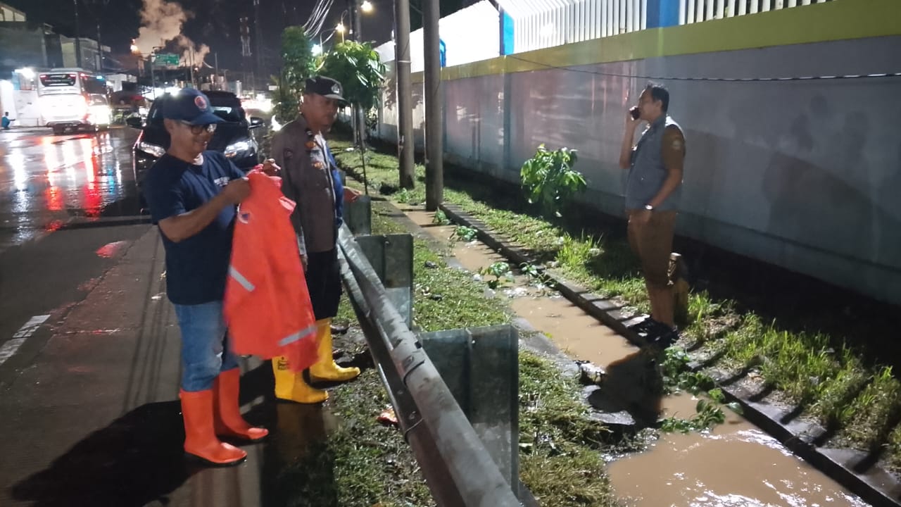 Cilegon - Personil Polsek Ciwandan melaksanakan monitoring genangan air dampak cuaca hujan lebat di wilayah hukum Polsek Ciwandan, Selasa (16/12/2025).