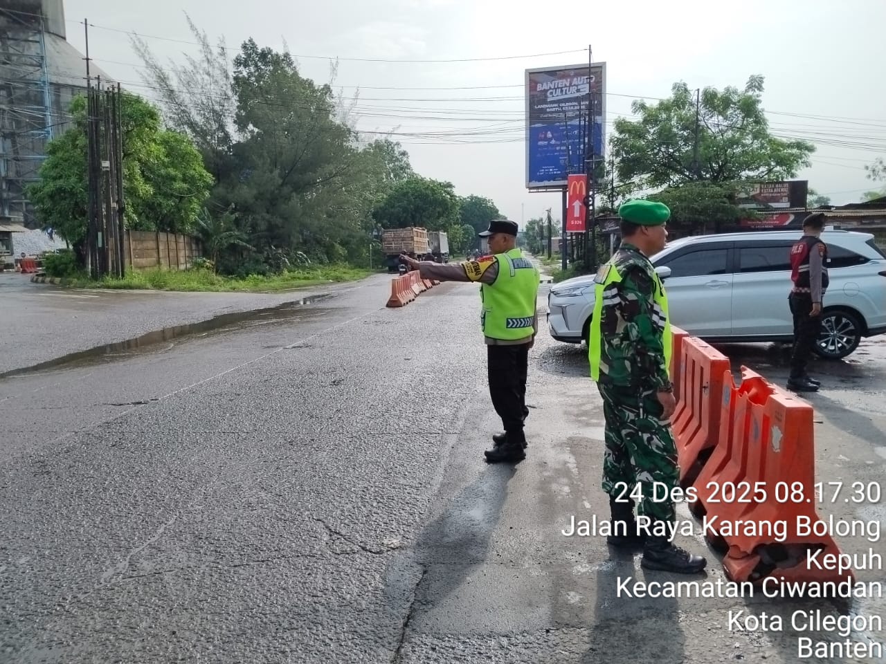 Cilegon - Guna Menciptakan kelancaran arus Mudik tahun 2025 yang menuju Pelabuhan Pelindo Dan jalur wisata yang ada di daerah hukum Polsek Ciwandan Polres Cilegon Polda Banten,Pospam 5 Ciwandan berlakukan rekayasa Lalu lintas, Rabu (24/12/2025).
