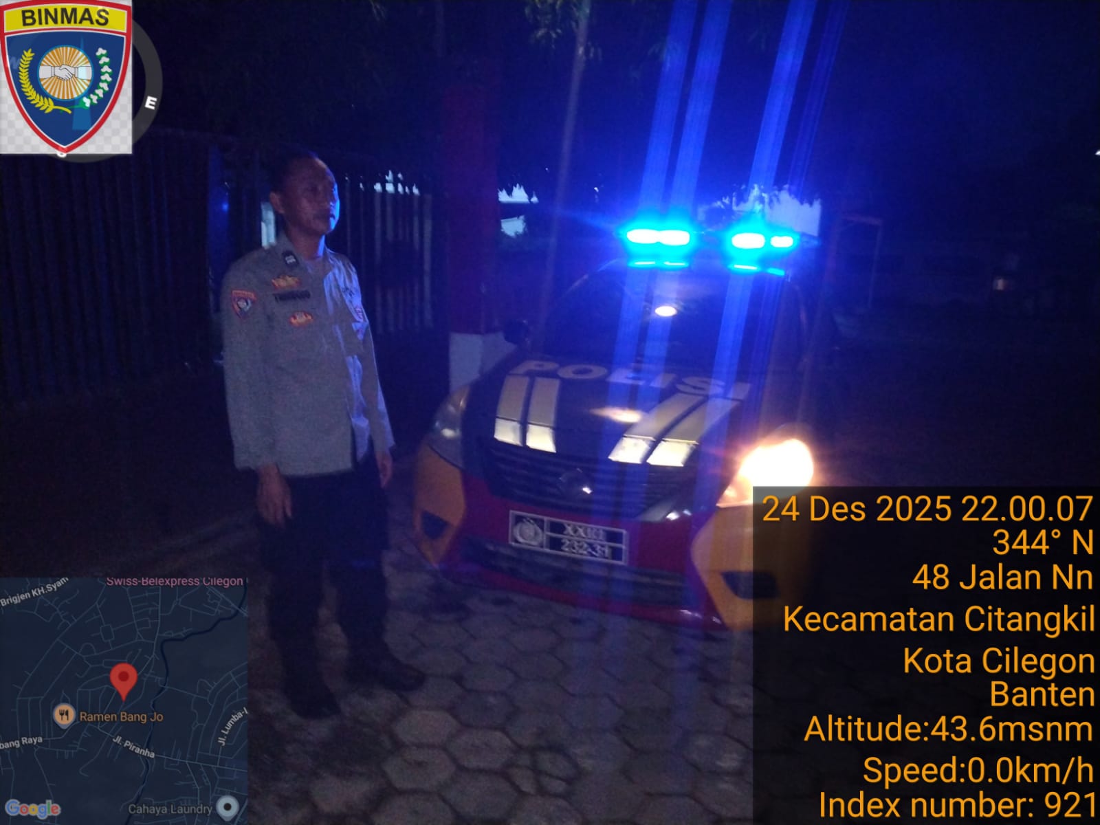 Cilegon - Personil Polsek Ciwandan Polres Cilegon Polda Banten Dalam Pelaksanaan Kegiatan Patroli dengan menyalakan lampu rotator berwarna biru di Daerah Hukum Polsek Ciwandan Polres Cilegon Polda Banten dari malam hingga dini hari, dalam rangka menciptakan situasi aman dan kondusif, Kamis (25/12/2025).