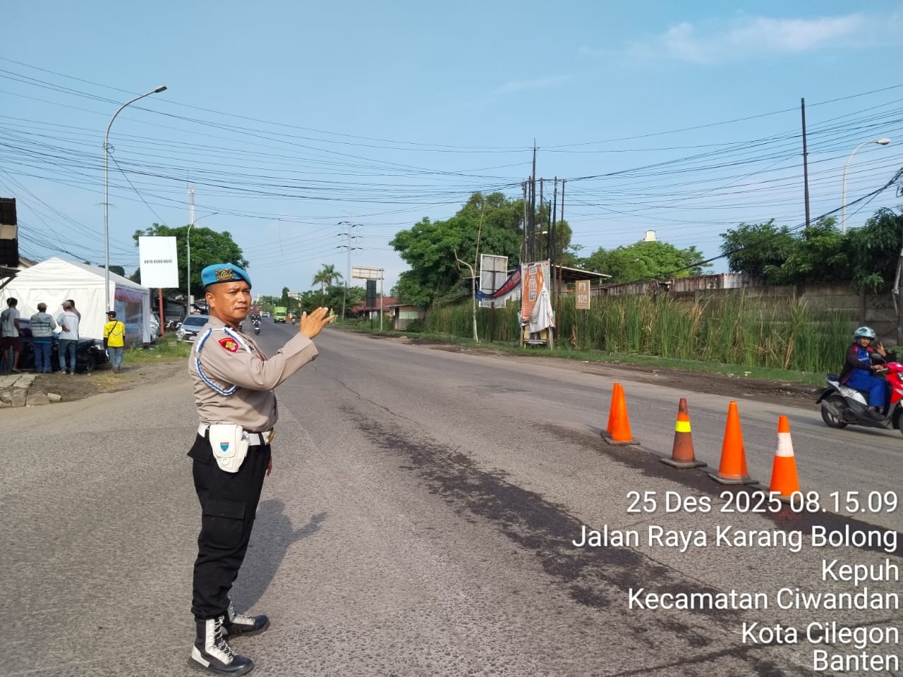 Cilegon - Guna Menciptakan kelancaran arus Mudik Natal tahun 2025 Dan Tahun Baru 2026 yang menuju Pelabuhan Pelindo Dan jalur wisata yang ada di daerah hukum Polsek Ciwandan Polres Cilegon Polda Banten,Pospam 5 Ciwandan berlakukan rekayasa Lalu lintas, Kamis (25/12/2025).