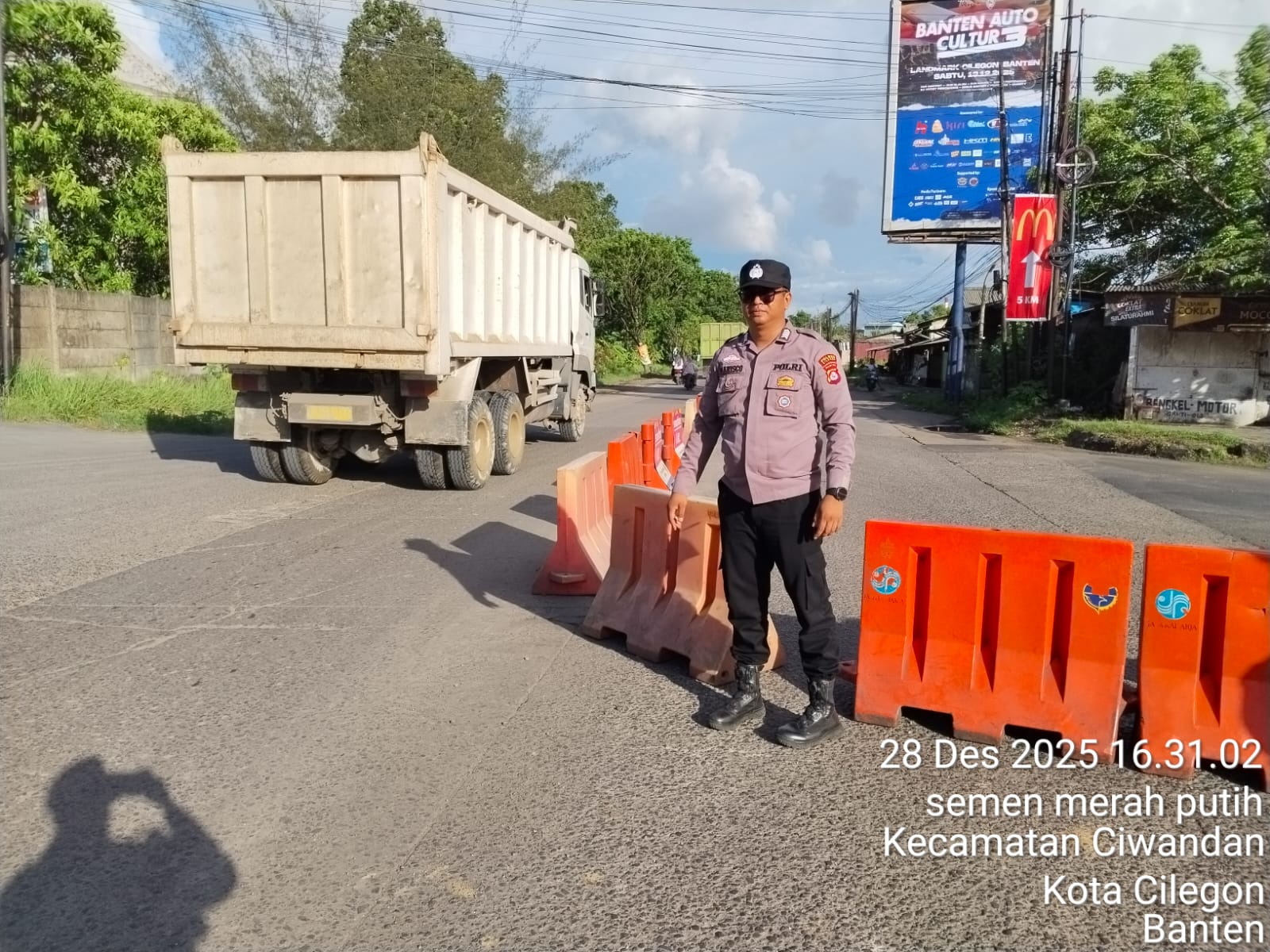 Cilegon - Guna Menciptakan kelancaran arus Lalu-Lintas Perayaan Natal Dan Tahun Baru menuju jalur wisata Anyer-Cinagka yang ada di daerah hukum Polsek Ciwandan Polres Cilegon Polda Banten,Pospam 5 Ciwandan berlakukan rekayasa Lalu lintas, Minggu (28/12/2025).