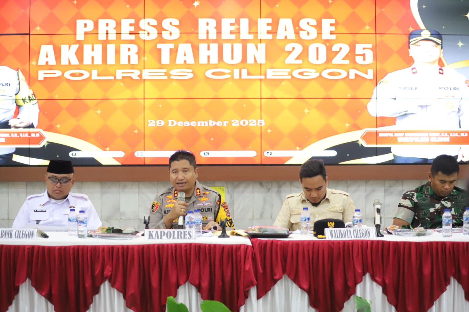 Dalam sambutannya,  Cilegon menyampaikan apresiasi kepada Forkopimda dan seluruh pihak yang telah mendukung rangkaian kegiatan Istighosah Doa Bersama, Pemusnahan Barang Bukti, hingga Press Release Akhir Tahun. Kapolres menegaskan bahwa capaian ini merupakan hasil konsistensi upaya preemtif, preventif, dan represif guna menjaga kamtibmas serta memberikan pelayanan terbaik bagi masyarakat.