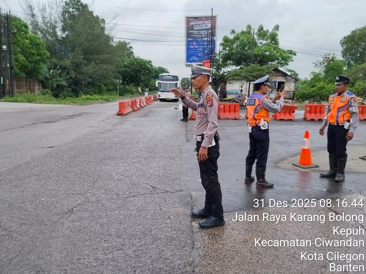 Cilegon - Guna Menciptakan kelancaran arus Mudik Natal tahun 2025 Dan Tahun Baru 2026 yang menuju Pelabuhan Pelindo Dan jalur wisata yang ada di daerah hukum Polsek Ciwandan Polres Cilegon Polda Banten,Pospam 5 Ciwandan berlakukan rekayasa Lalu lintas, Rabu (31/12/2025).