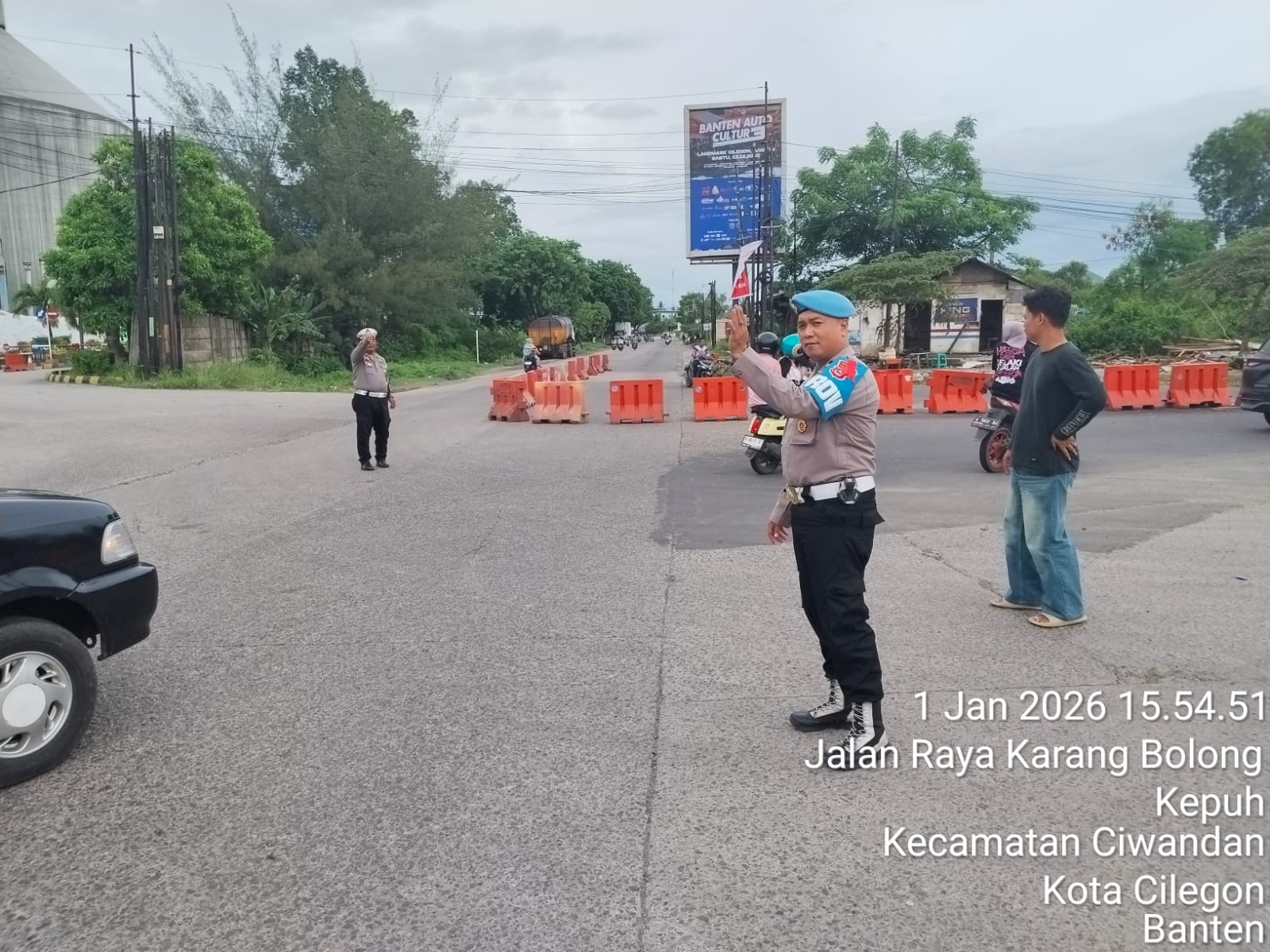 Cilegon - Guna Menciptakan kelancaran arus Mudik Natal tahun 2025 Dan Tahun Baru 2026 yang menuju Pelabuhan Pelindo Dan jalur wisata yang ada di daerah hukum Polsek Ciwandan Polres Cilegon Polda Banten,Pospam 5 Ciwandan berlakukan rekayasa Lalu lintas, Kamis (01/01/2026).