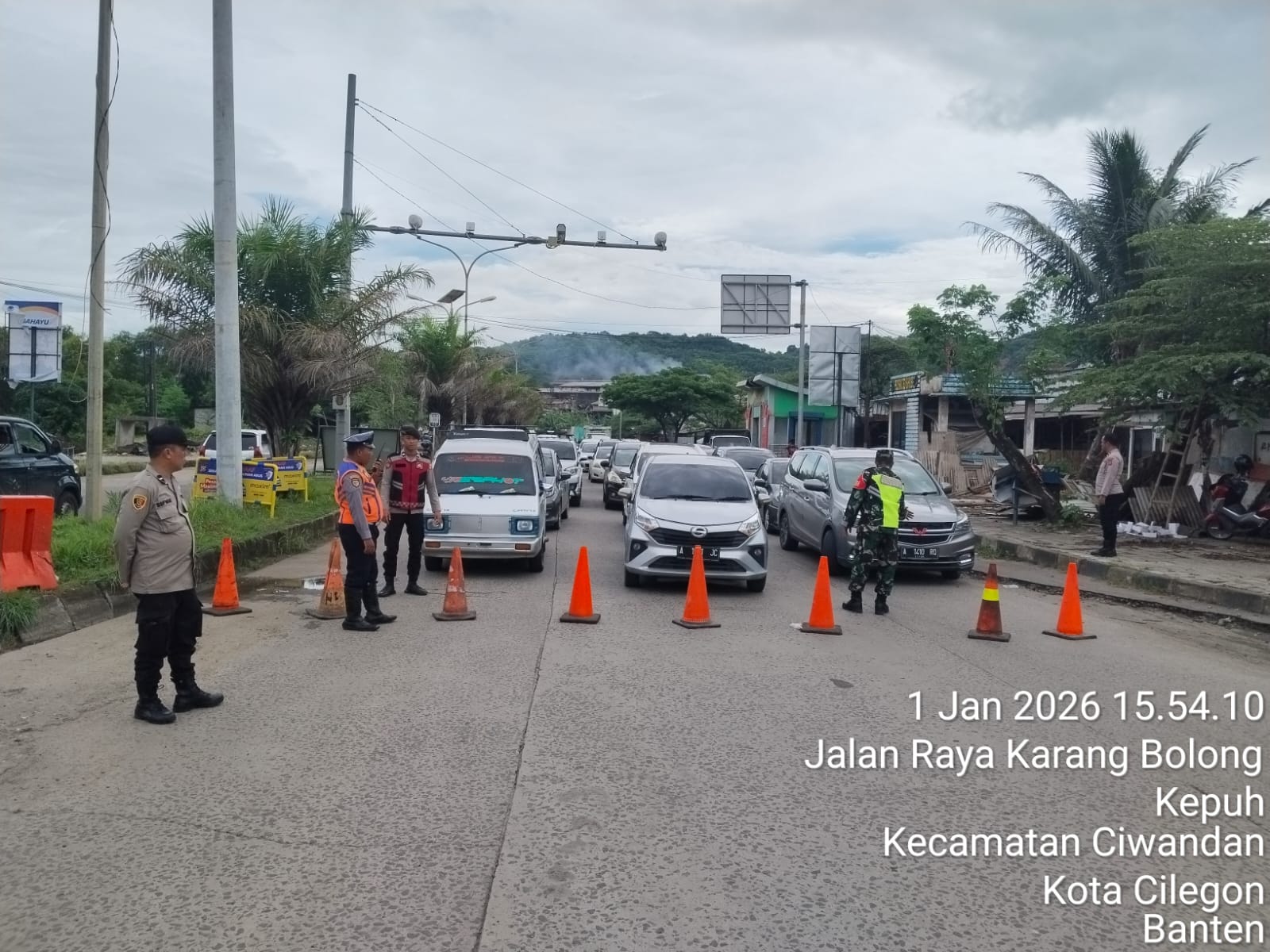 Cilegon - Guna Menciptakan kelancaran arus Mudik Natal tahun 2025 Dan Tahun Baru 2026 yang menuju Pelabuhan Pelindo Dan jalur wisata yang ada di daerah hukum Polsek Ciwandan Polres Cilegon Polda Banten,Pospam 5 Ciwandan berlakukan rekayasa Lalu lintas, Kamis (01/01/2026).