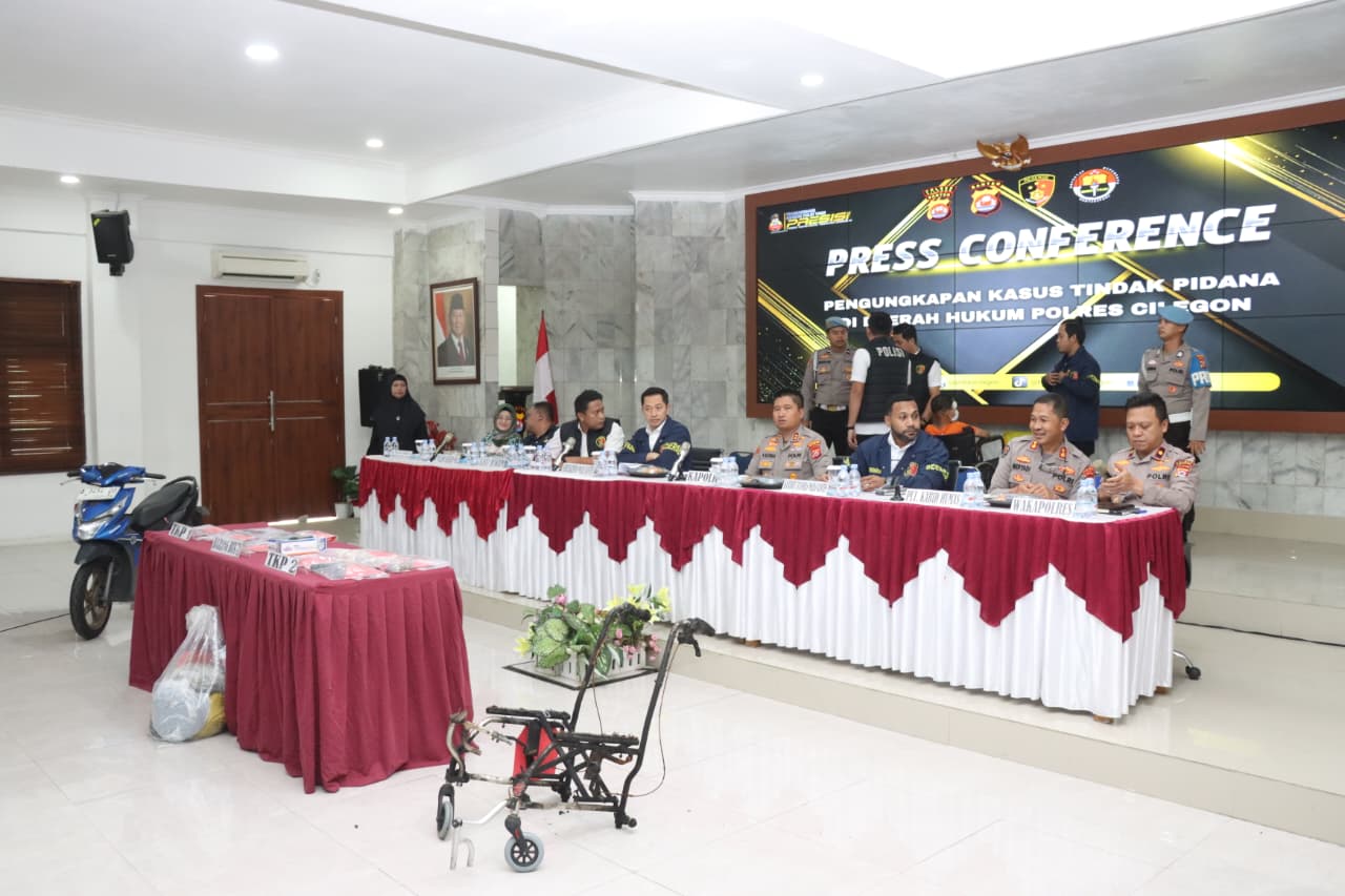 Press conference tersebut disampaikan oleh Ditreskrimum Polda Banten Kombes Pol Dian Setyawan didampingi Kapolres Cilegon AKBP Dr. Martua Raja Taripar Laut Silitonga, Plh. Kabid Humas Polda Banten AKBP Meryadi, Wakapolres Cilegon Kompol Arief Nazarudin, Kasubdit Jatanran Ditreskrimum Polda Banten Kompol Yeremia Iwo, Kasat Reskrim Polres Cilegon AKP Yoga Tama, Ka Instalasi Forensik Modikolegal RSUD Cilegon Dr. Baeti Adhayati SP FM, Puslabfor Polri Kompol Irfan Rofik.