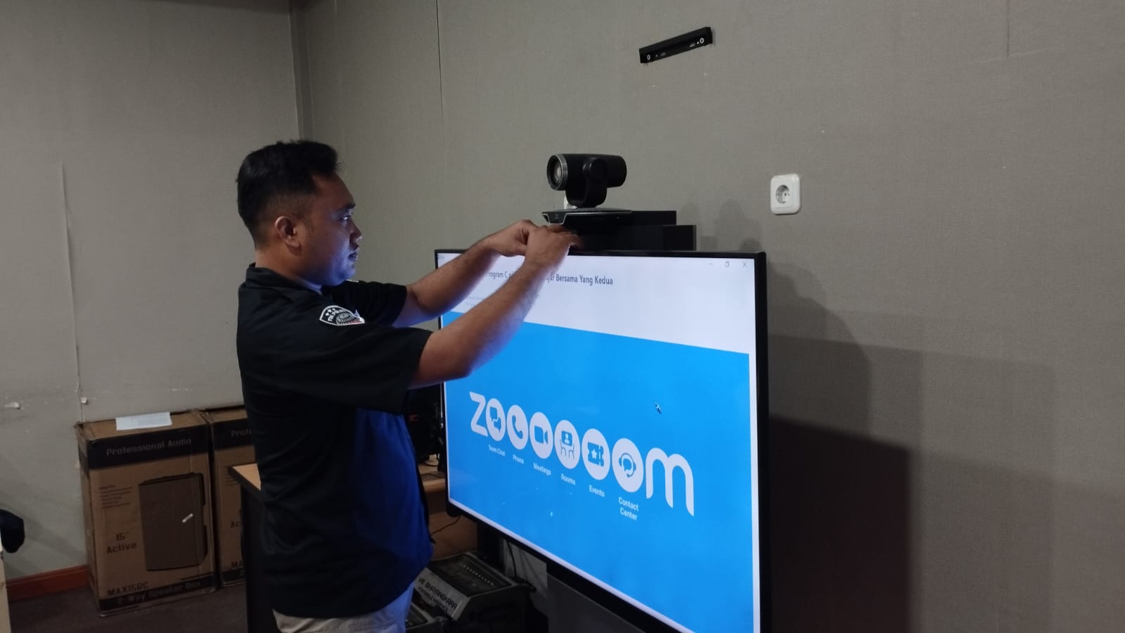 Anggota Tik Polres Cilegon Menyiapkan Sarana dan Prasarana Untuk Kegiatan Zoom meeting Dalam pelaksanaan kegiatan zoom meeting tersebut anggota TIK Polres Cilegon yang bertanggung jawab untuk menyiapkan peralatan zoom. Selain itu agar di tidak ada gangguan jaringan sebelum pelaksanaan anggota TIK melakukan pemeriksaan terhadap sarana dan prasarana tersebut . Satu jam sebelum kegiatan zoom meeting itu dimulai. Kapolres Cilegon AKBP. DR. MARTUA RAJA TARIPAR LAUT SILITONGA. melalui Kasi TIK AIPTU Suwanto, S.H. menyampaikan bahwa “untuk menunjang kelancaran penyampaian informasi anggota TIk Polres Cilegon selalu memeriksa sarana dan prasarana tersebut, sebelum maupun pada saat pelaksanaan akan selalu di monito