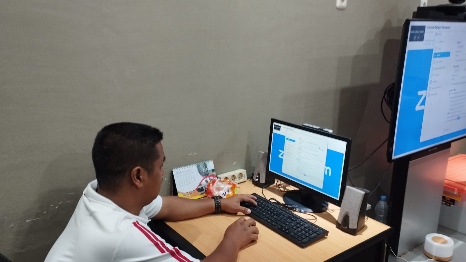 Anggota Tik Polres Cilegon Menyiapkan Sarana dan Prasarana Untuk Kegiatan Zoom meeting Dalam pelaksanaan kegiatan zoom meeting tersebut anggota TIK Polres Cilegon yang bertanggung jawab untuk menyiapkan peralatan zoom. Selain itu agar di tidak ada gangguan jaringan sebelum pelaksanaan anggota TIK melakukan pemeriksaan terhadap sarana dan prasarana tersebut . Satu jam sebelum kegiatan zoom meeting itu dimulai. Kapolres Cilegon AKBP. DR. MARTUA RAJA TARIPAR LAUT SILITONGA. melalui Kasi TIK AIPTU Suwanto, S.H. menyampaikan bahwa “untuk menunjang kelancaran penyampaian informasi anggota TIk Polres Cilegon selalu memeriksa sarana dan prasarana tersebut, sebelum maupun pada saat pelaksanaan akan selalu di monitor”