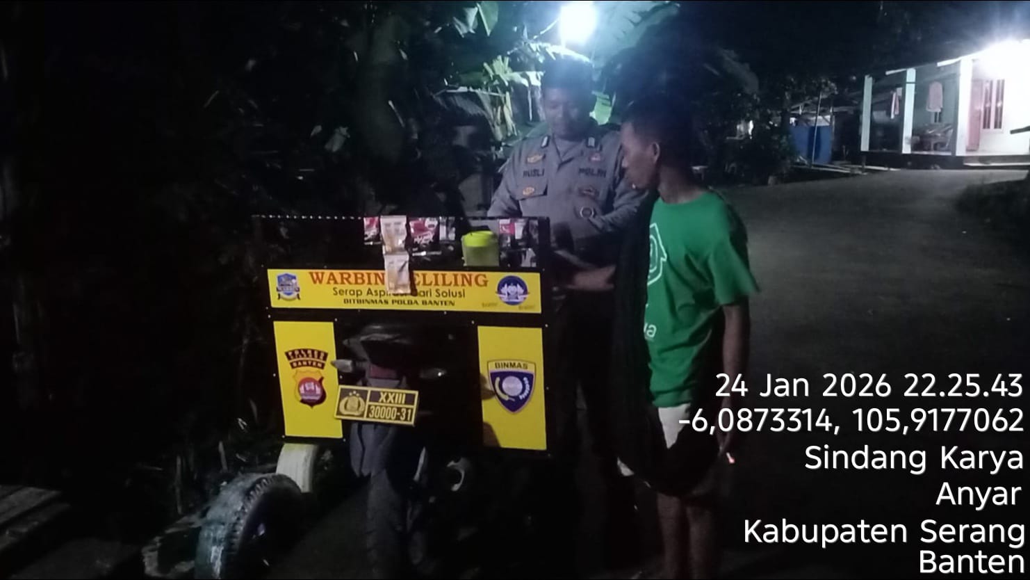 Kapolsek Ciwandan dan Bhabinkamtibmas Ciwandan melaksanakan kegiatan patroli untuk menjaga situasi kamtibmas yang aman dan kondusif. Kegiatan patroli ini dilakukan untuk ¹: