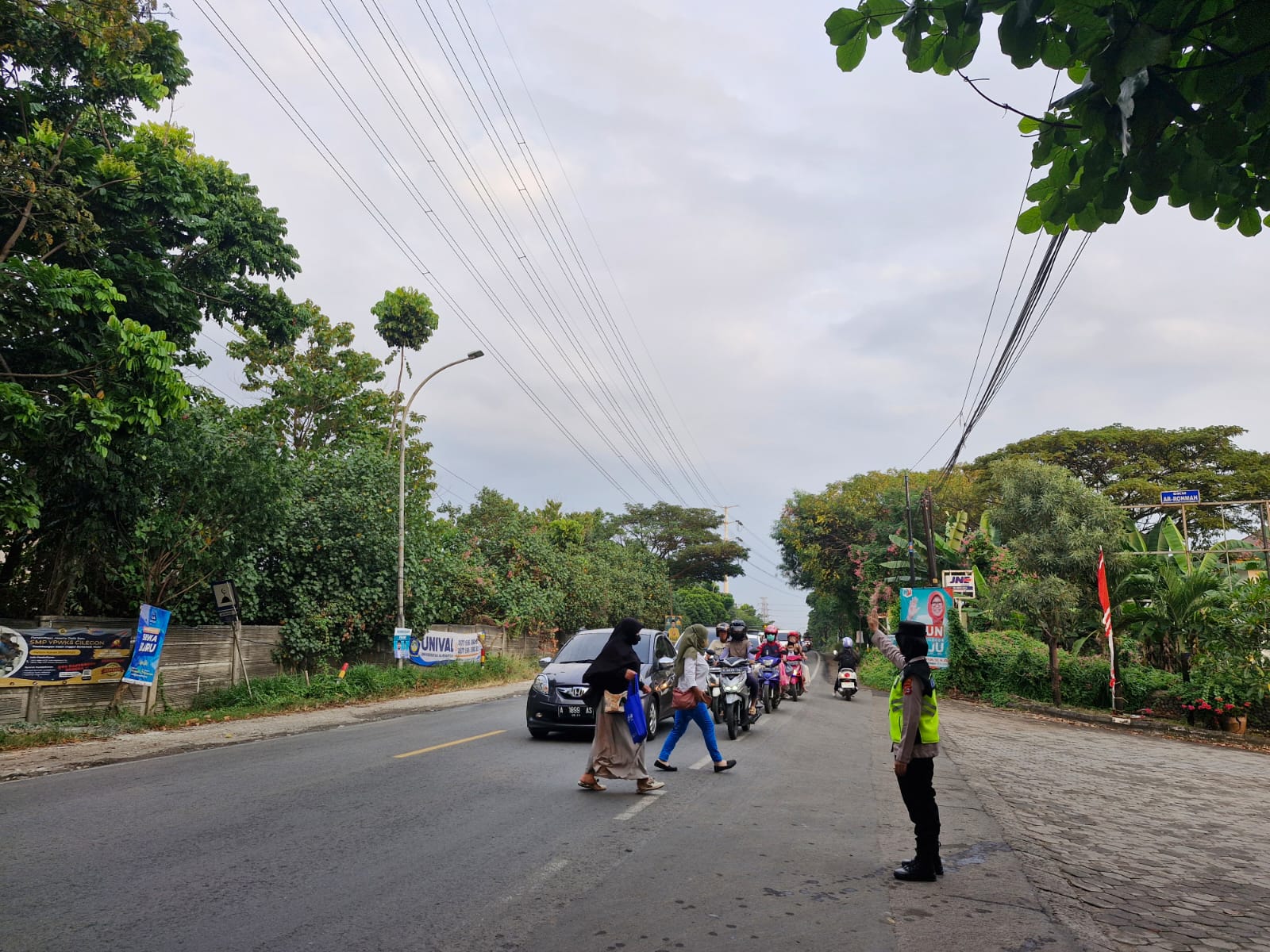 Cilegon,Polres Cilegon Polda Banten Pada Kamis /29/01/2026 Pukul 06.30 Wib, Personil Siwas Polres Cilegon, Aipda Emi Prasetyo melaksanakan kegiatan pengaturan arus lalu lintas di Jalur Protokol jalan utama Kota Cilegon tepat nya di jalur depan perumahan arga baja Pura Kota Cilegon.