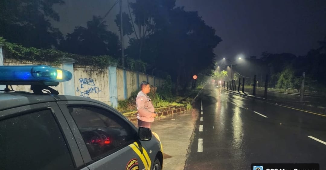 terlihat satu unit kendaraan patroli berada di sisi jalan dengan petugas yang sedang memantau sekitar. Permukaan jalan tampak basah dan licin, kemungkinan akibat hujan yang pernah turun sebelumnya. Pencahayaan di lokasi cukup terbatas, namun lampu jalan yang tersebar membantu menjaga visibilitas pada malam hari.