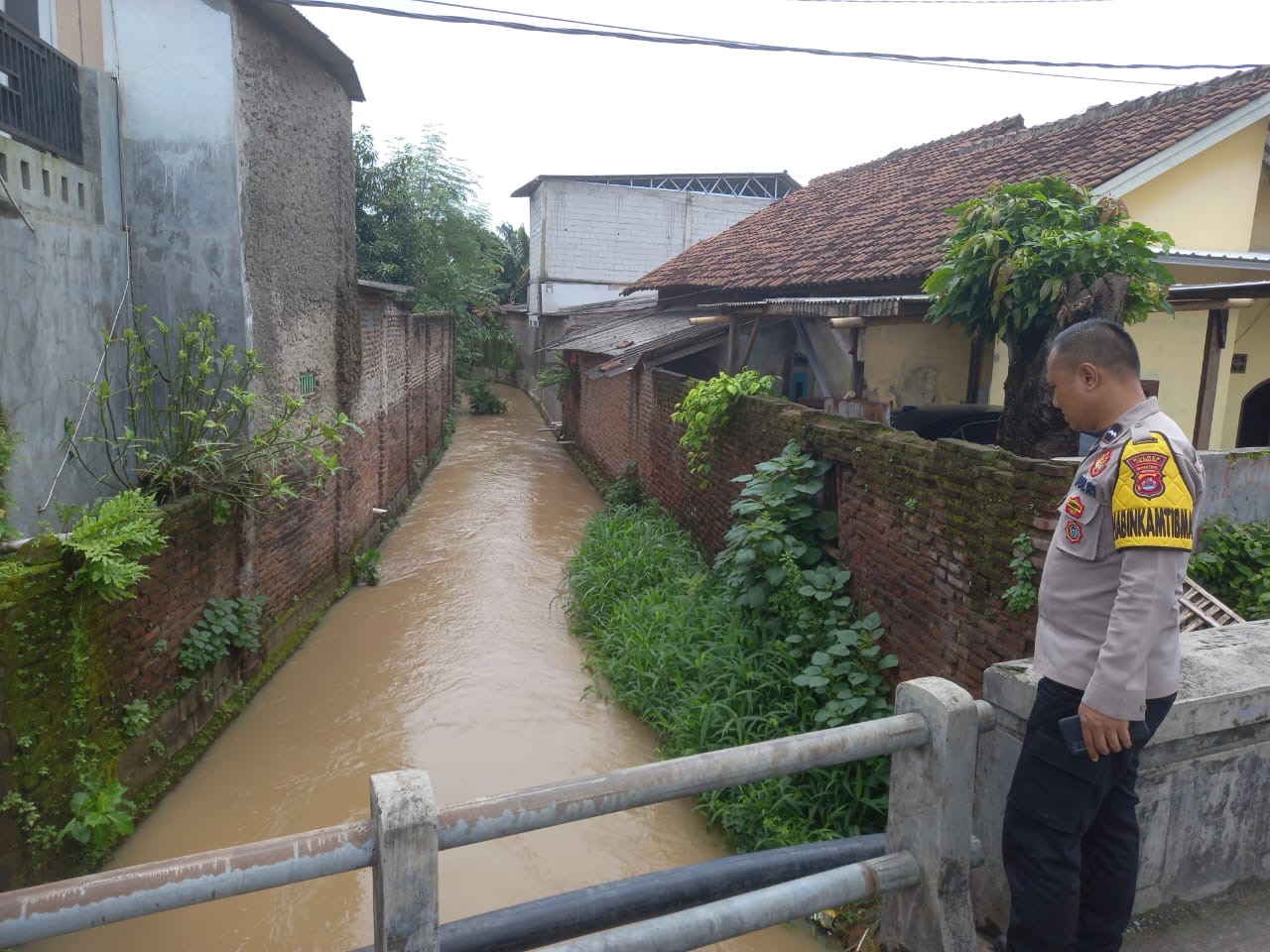 personel Polri sedang memeriksa aliran air di saluran yang tampak keruh dan penuh dengan lumpur, kemungkinan akibat debit air yang meningkat. Di sekitar saluran juga terlihat tumbuhan liar yang tumbuh dan sedikit sampah yang menumpuk, yang berpotensi menyumbat aliran air. Latar belakang menunjukkan kawasan pemukiman warga dengan rumah-rumah berlantai satu dan dua, serta pepohonan kelapa yang menjulang.