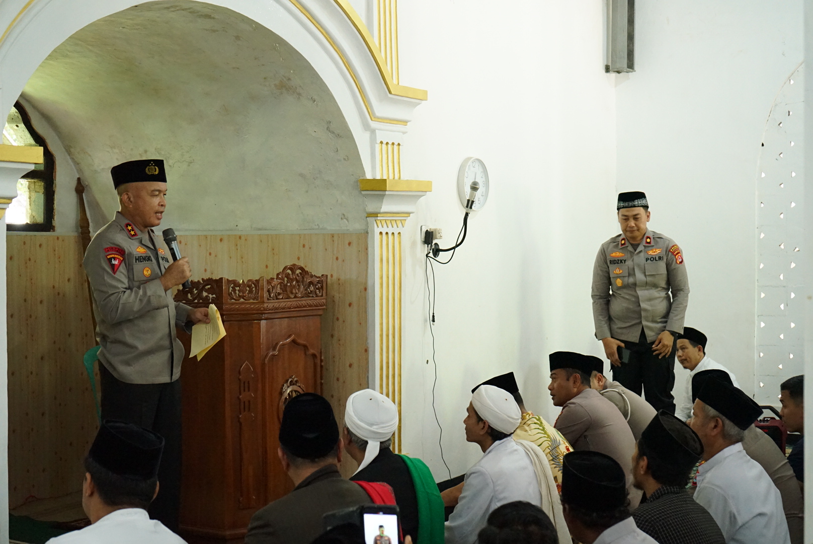 Cilegon –Kapolres Cilegon AKBP Dr Martua Raja Taripar Laut Silitonga S.H S.IK M.S.I mendampingi Kapolda Banten Irjen Pol Hengki S.IK,M.H melaksanakan kegiatan Salat Jumat Keliling (Jumling) di Masjid Miftahul Huda, Pondok Pesantren TQN Al-Mubarok, Kampung Pasir Angin, Desa Cinangka, Kecamatan Cinangka, Kabupaten Serang ,Jumat 10/4/26 Kegiatan tersebut diikuti oleh para Pejabat Utama Polda Banten dan pejabat utama Polres Cilegon, tokoh agama, tokoh masyarakat, serta para jamaah salat Jumat. Dalam kesempatan tersebut, Kapolda Banten menyampaikan bahwa program Salat Jumat Keliling merupakan salah satu upaya Polri untuk lebih mendekatkan diri dengan masyarakat sekaligus mempererat silaturahmi. “Program Salat Jumat Keliling ini merupakan ikhtiar kami untuk mempererat silaturahmi dan menghadirkan Polri di tengah masyarakat, tidak hanya dalam tugas, tetapi juga berbagi rasa dalam suka dan duka,” ujar Kapolda Banten. Kapolda Banten juga menyampaikan bahwa situasi kamtibmas di wilayah Banten saat ini dalam keadaan aman dan kondusif. “Alhamdulillah, situasi kamtibmas di Banten saat ini aman dan kondusif, sehingga masyarakat dapat melaksanakan ibadah dengan tenang,” lanjutnya. Selain itu, Kapolda Banten mengingatkan bahwa ke depan tantangan kamtibmas akan semakin kompleks seiring perkembangan teknologi dan informasi. “Kami menghimbau masyarakat agar waspada terhadap penyebaran hoaks, ujaran kebencian, provokasi isu SARA, kejahatan berbasis teknologi, serta penyalahgunaan narkoba,” tegasnya. Lebih lanjut, Kapolda turut mengajak masyarakat untuk tidak mudah terprovokasi dan lebih bijak dalam menggunakan media sosial, serta menjaga persatuan dan kerukunan. “Mari kita bersama-sama menjaga persatuan dan meningkatkan toleransi antar umat beragama demi terciptanya situasi yang aman dan damai,” tambahnya. Diakhir, Kapolda Banten mengajak masyarakat untuk memanfaatkan layanan kepolisian. “Saya mengajak seluruh masyarakat untuk memanfaatkan layanan kepolisian, salah satunya layanan Call Center 110 yang aktif 24 jam secara gratis. Melalui layanan ini, masyarakat dapat dengan mudah melaporkan setiap gangguan kamtibmas maupun kejadian yang membutuhkan kehadiran polisi, sehingga dapat segera ditindaklanjuti secara cepat, tepat oleh petugas,” tutup Kapolda Banten. Hadir dalam kegiatan tersebut untuk.pejabat utama Polda Banten 1). Dirreskrimum Polda Banten KOMBES POL. DIAN SETYAWAN, S.H., S.I.K., M.Hum 2). Dirbinmas Polda Banten KOMBES POL IMAM TARMUDI, S.I.K., M.H. 3). Dirlantas Polda Banten Kombes Pol. Arief Kurniawan, S.I.K. 4). Kabid Humas Polda Banten KOMBES POL. Maruli Ahiles Hutapea, S.I.K. 5). Kabid Propam Polda Banten KOMBES POL. MURWOTO, S.H., S.I.K., M.H. 6). Dirintel Polda Banten KOMBES POL. ATOT IRAWAN, S.I.K., M.M 8). Kapolres Cilegon AKBP Dr. MARTUA RAJA TARIPAR LAUT SILITONGA, S.H, S.Ik, M.Si. Pejabat Utama Polres Cilegon 1). Wakapolres Cilegon KOMPOL M. RIZKI SALATUN, S.IK. 2). Kabag SDM Polres Cilegon KOMPOL ENTANG CAHYADI, S.H., M.A 3). Kabaglog Polres Cilegon AKP SUDIBYO WARDOYO, S.H, M.M 4). Kasat Sabhara Polres Cilegon AKP AGUS HENDRATNO 5). Kasat Lantas Polres Cilegon AKP RIDWAN S.TK., S.I.K., M.H 6). Kasi Humas Polres Cilegon AKP SIGIT DERMAWAN, S.H. 7). Kasie Propam Polres Cilegon AKP HERI SUSANTO, S.H, M.M. 8). Kapolsek Cinangka AKP RUSNATA, S.H., S.KOM. 9). Kasiwas Polres Cilegon IPTU HARIS SURAHMAN 10). Kasat Intelkam Polres Cilegon IPTU RISWAN WIJAYA, S.H Tokoh masyarakat 1). Pimpinan Ponpes TQN Al Mubarok KH.RD.M.YUSUF PRIANADI,SH 2). Tokoh Agama Pimpinan Ponpes Nur Sejati KH.DAMANHURI 3). Ketua DPC NU Kec.Cinangka USTADZ.DAMAN