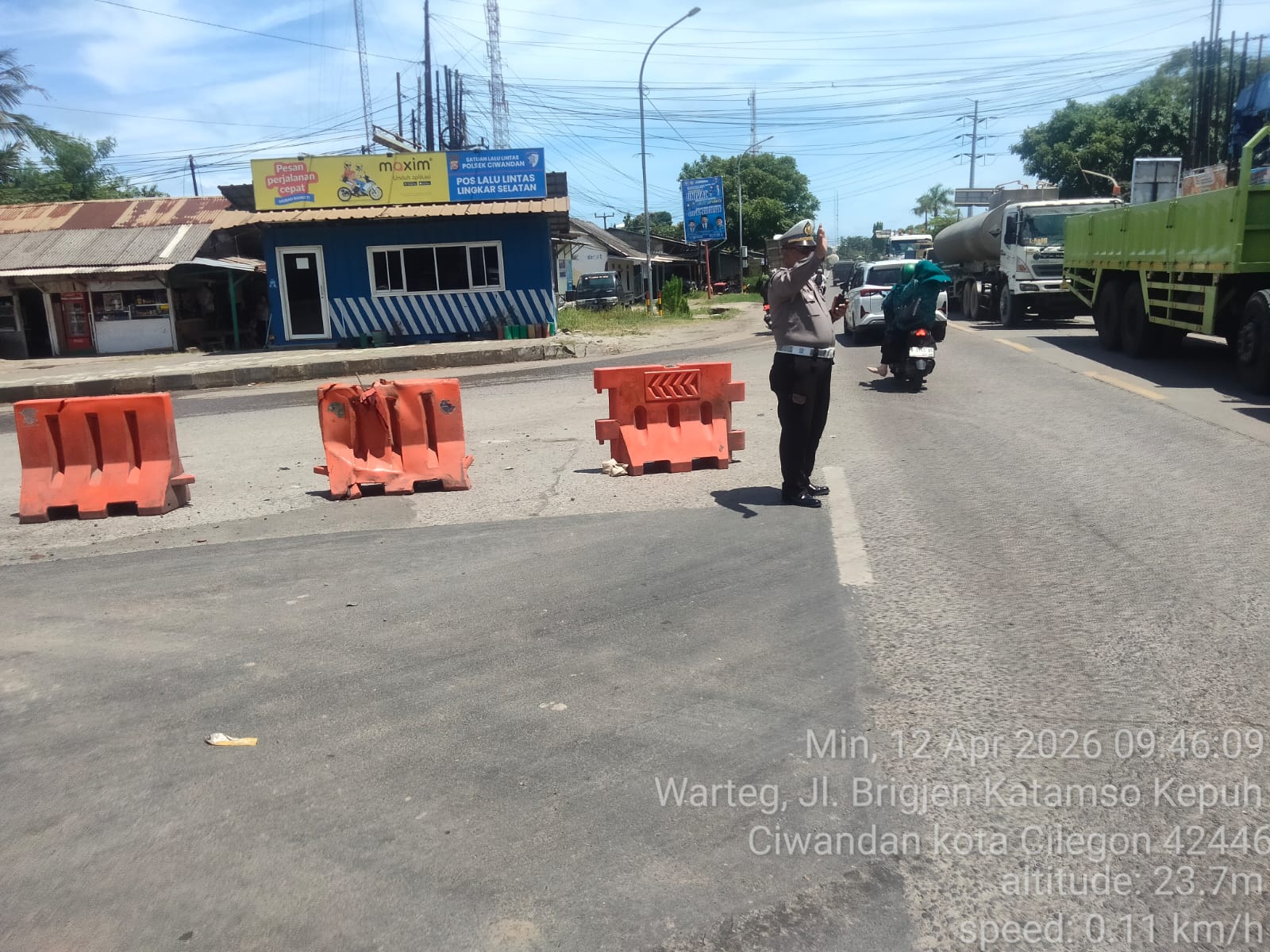 Personil Polsek Ciwandan melakukan pengaturan lalu lintas di depan Pos Lantas JLS Ciwandan dan peneguran terhadap pelanggaran kasat mata. Kegiatan ini dilaksanakan untuk memastikan keamanan dan kelancaran arus lalu lintas di wilayah hukum Polsek Ciwandan.