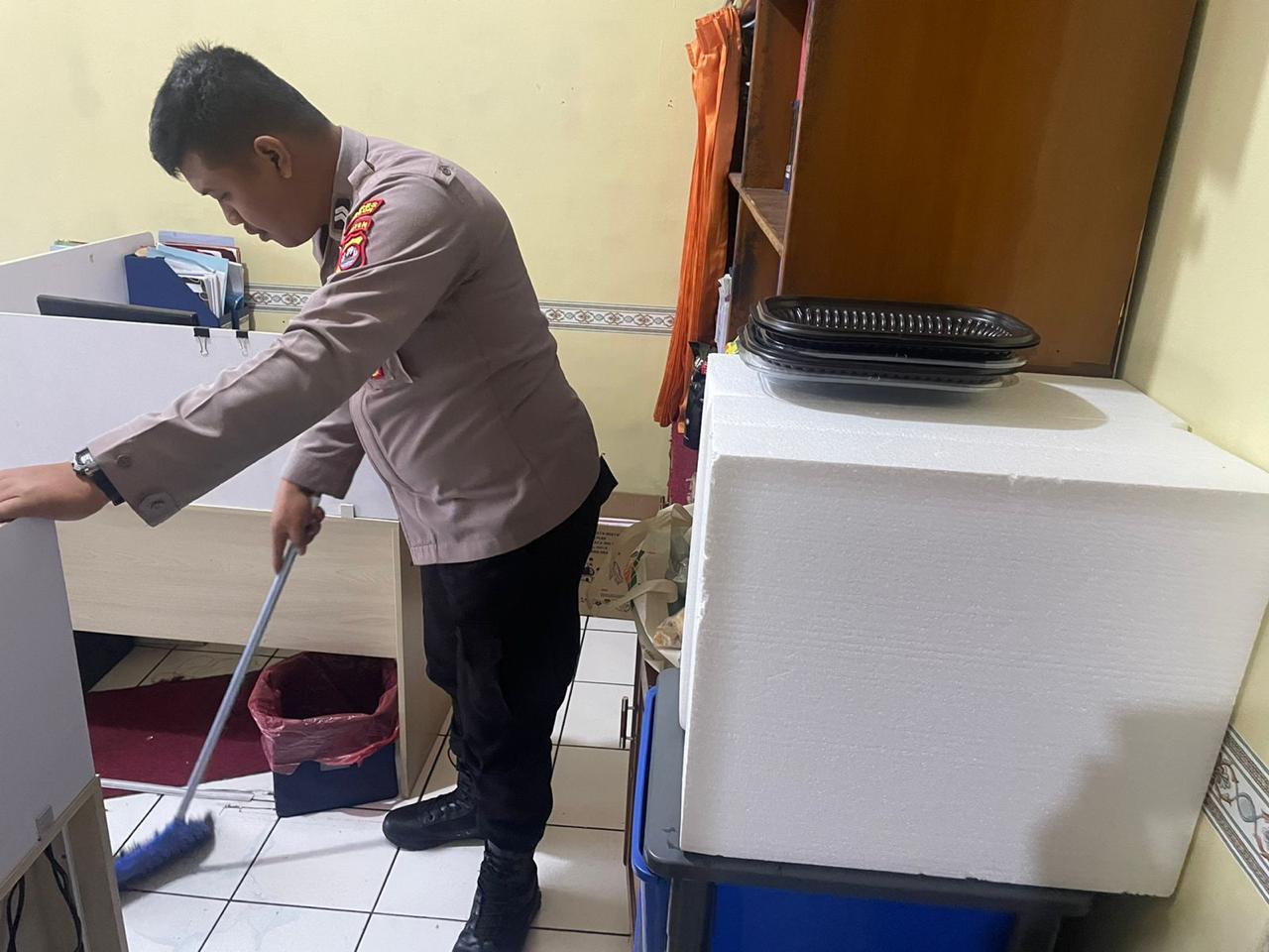 anggota SDM Polres Cilegon, Melaksanakan meenjaga kebersian aktifdi ruangan kerja setiap saat.