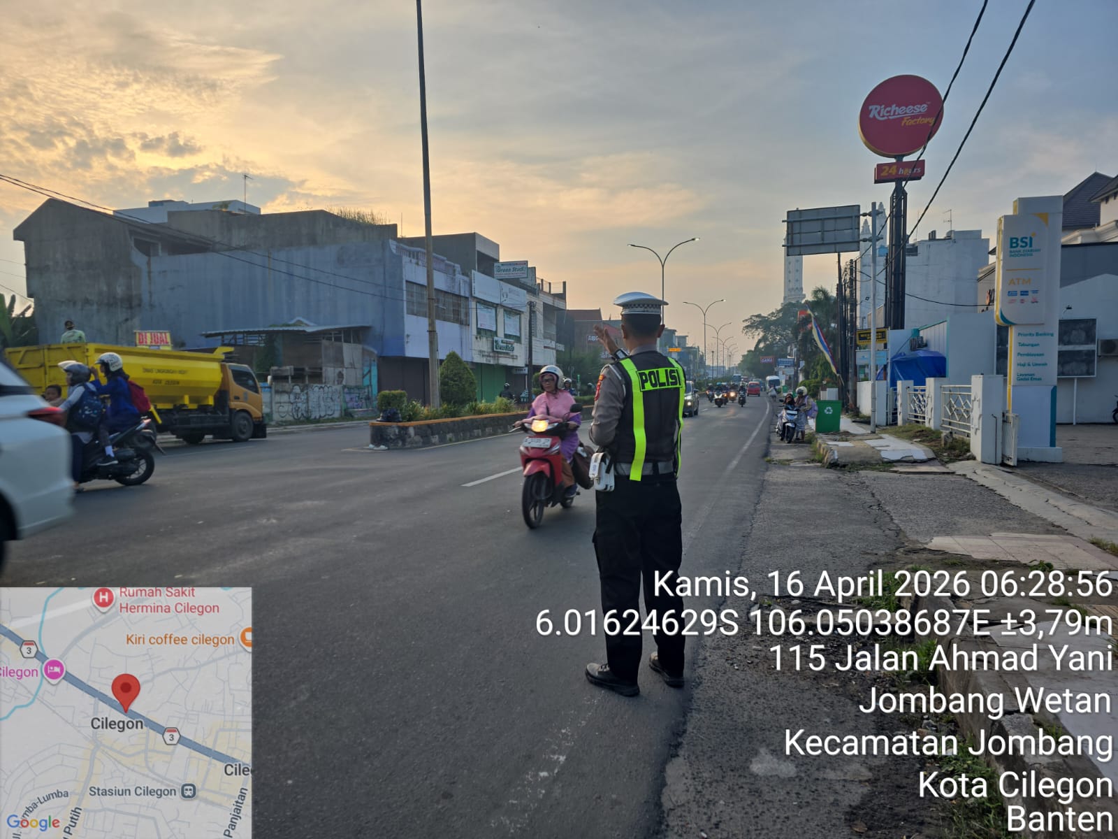 Cilegon, Satlantas Polres Cilegon Polda Banten – Berikan pelayanan kepada masyarakat Kasat lantas Polres Cilegon AKP Ridwan memerintahkan jajaran lalulintas untuk melaksanakan pengaturan lalu lintas di penggal – penggal jalan yang rawan kemacetan di Kota Cilegon, (Kamis,16/4/2026)