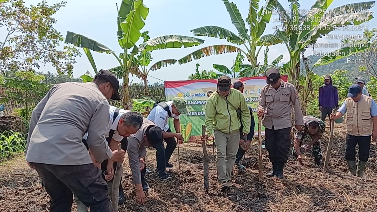 -POLRES CILEGON- Polda Banten.Mendukung program ketahanan pangan nasional, Polres Cilegon,Polsek Cinangka bersama Ketua Kelompok Tani melaksanakan penanaman jagung serentak di Desa Rancasanggal Kecamatan Cinangka Kab Serang. Rabu (10-08-2025)