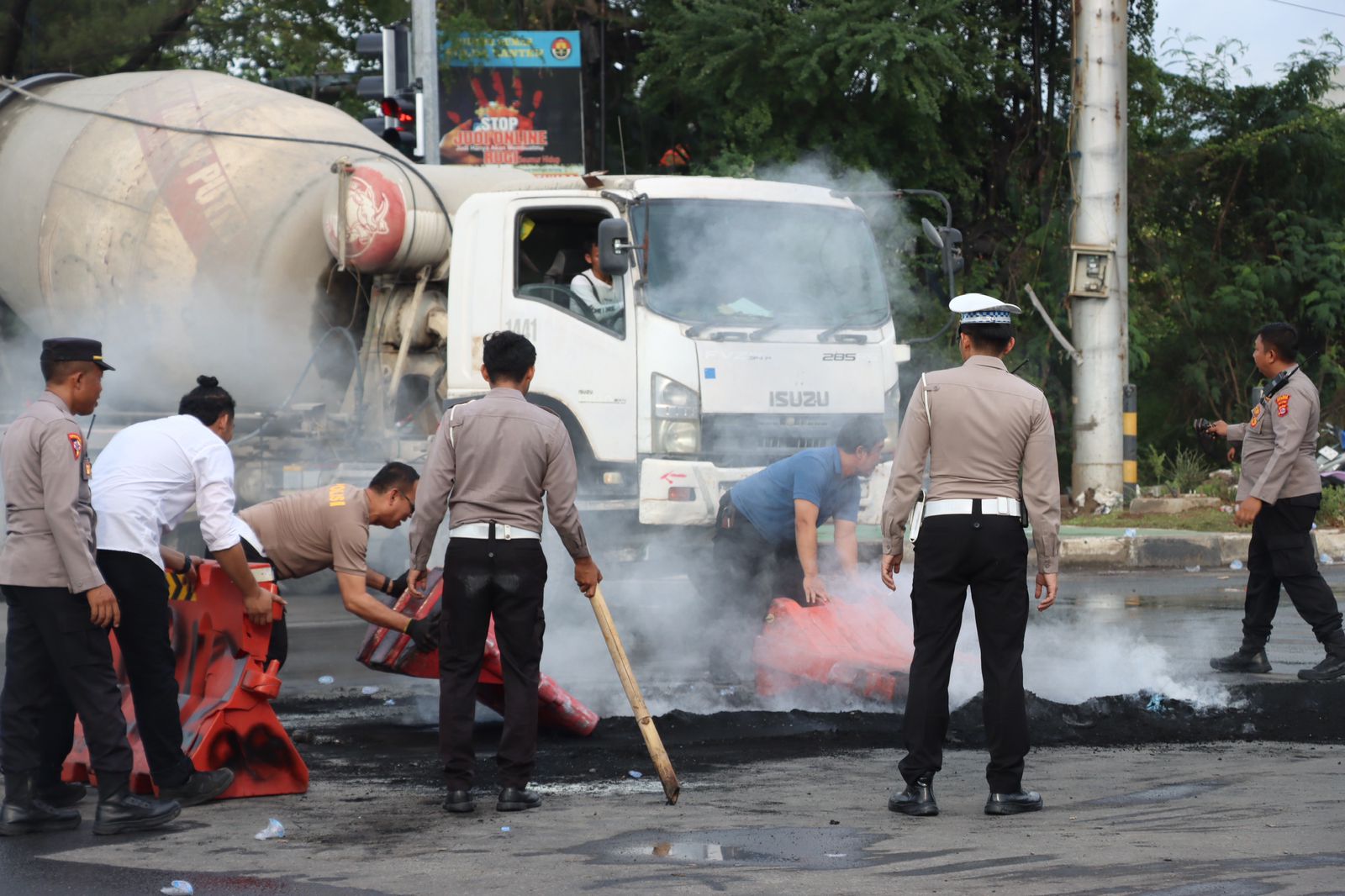 Pada pukul 14.30 WIB, massa melakukan pembakaran ban di simpang jalan sebagai bentuk ekspresi aksi. Menyikapi situasi tersebut, personel Polres Cilegon tetap mengedepankan pendekatan persuasif dan humanis agar situasi tetap terkendali.
