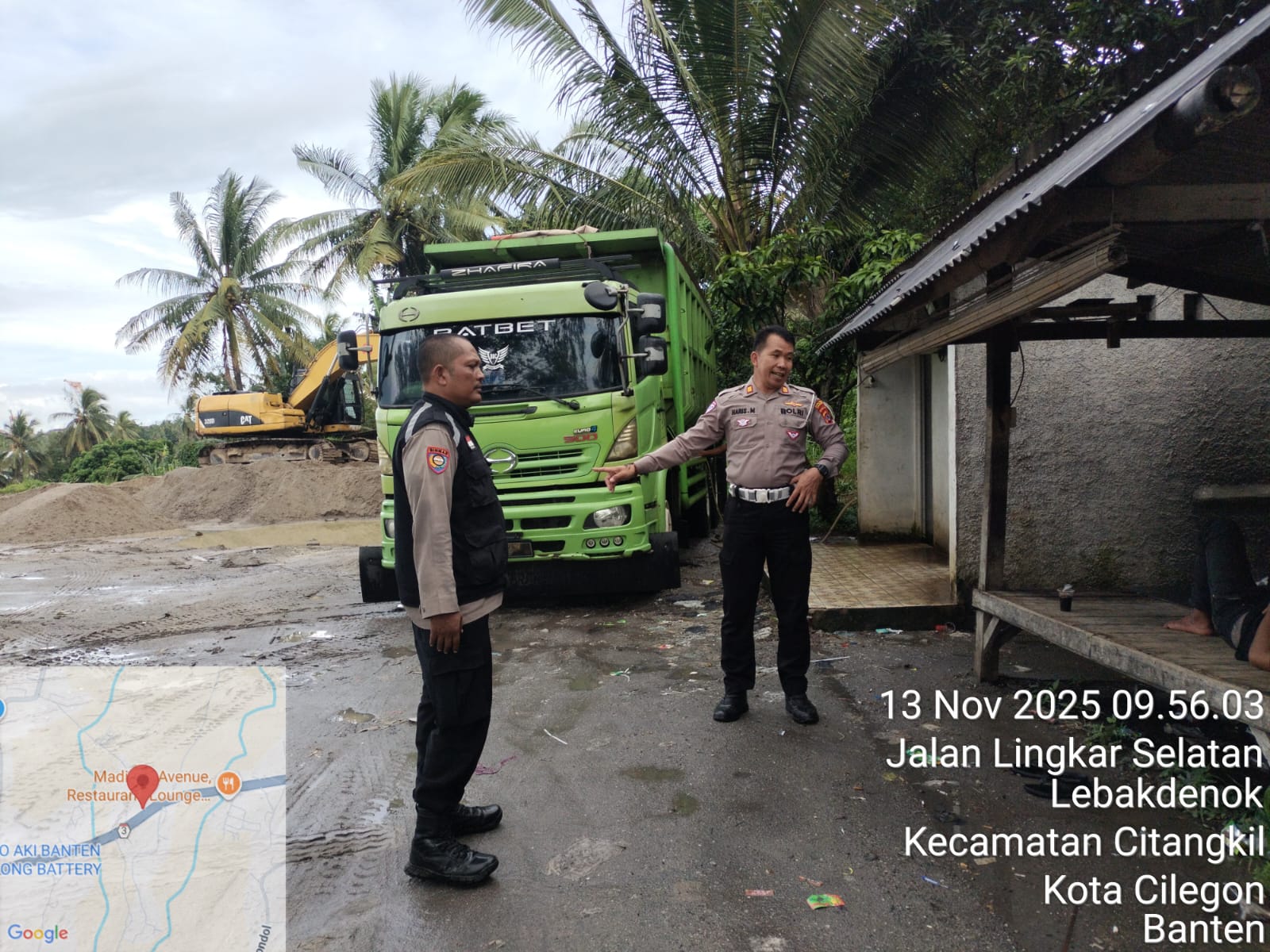 Cilegon - Kanit Lantas Polsek Ciwandan AKP Haris Munandar Bersama Bhabinkamtibmas Kelurahan Lebak Denok AIPTU Yudi Setiawan melaksanakan Himbauan SK Gubernur Dan monitoring stokfile pasir Didaerah hukum Polsek Ciwandan, Kamis (13/11/2025).