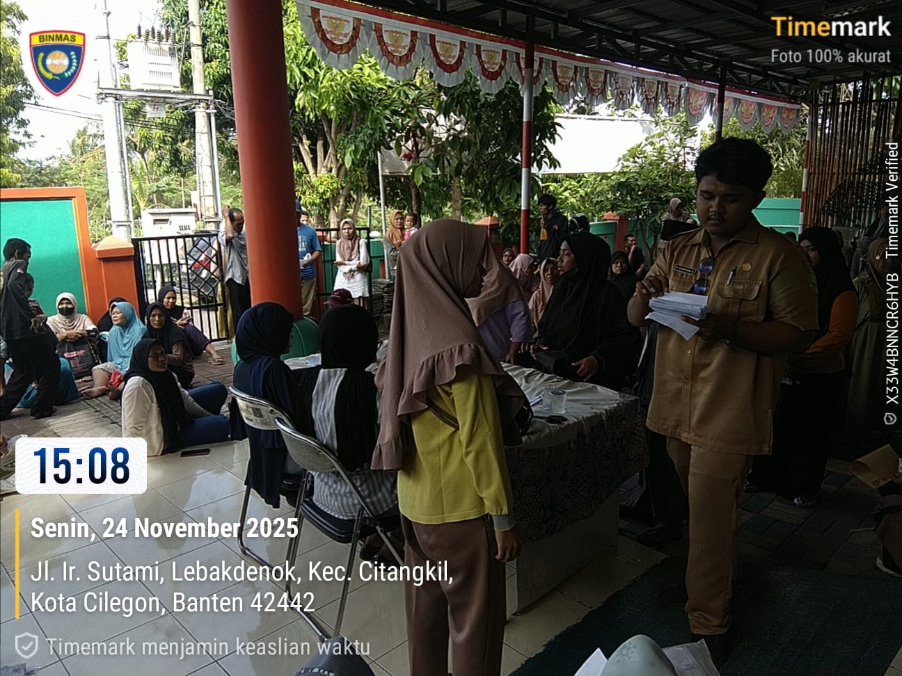 Cilegon - Bhabinkamtibmas Kelurahan Lebak Denok, AIPTU YUDI SETIAWAN, melaksanakan pengamanan dan monitoring bantuan langsung tunai dari Kementerian Sosial RI di Kantor Kelurahan Lebak Denok, Kecamatan Citangkil, Kota Cilegon, Senin (24/11/2025).