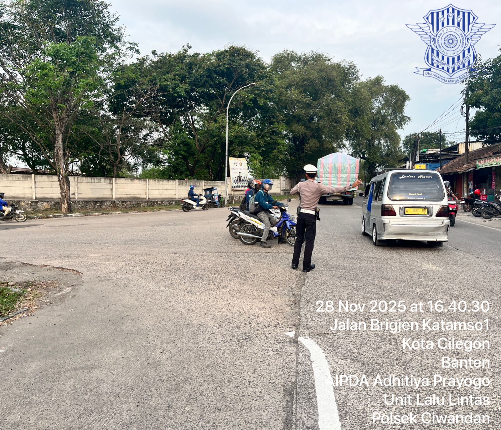Cilegon - Guna Kelancaran Lalu-lintas Personil Unit Lantas Polsek Ciwandan Polres Cilegon Polda Banten melaksanakan pengaturan lalu-lintas di Simpang Beringin Ciwandan Pertigaan Kawasan Industri KSP/ KIEC I  kelurahan Warnasari Kecamatan Citangkil Kota Cilegon, Minggu (30/11/2025).