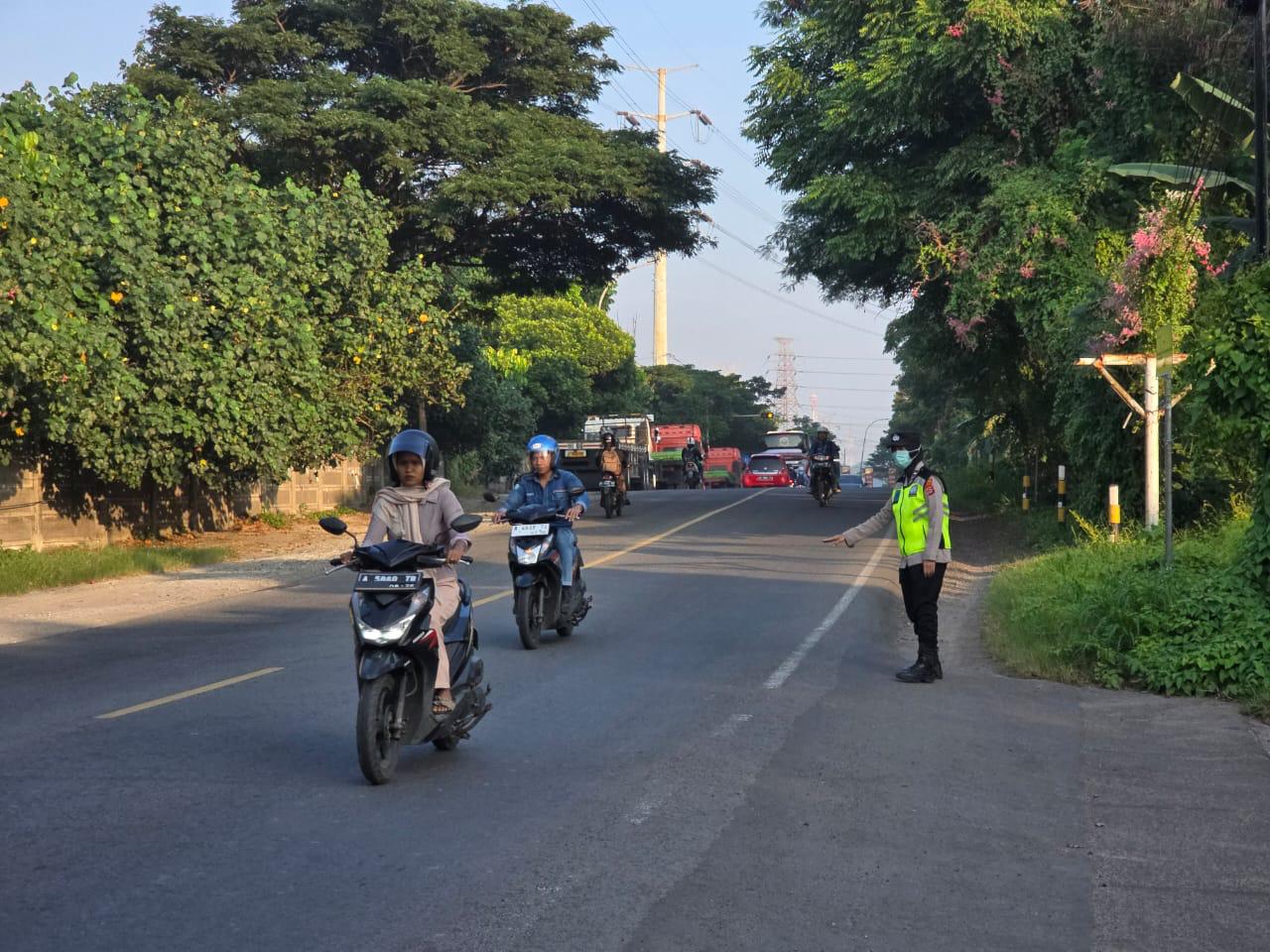 Aipda Emi Prasetyo Melaksanakan kegiatan Pelayanan pengaturan Arus Lalin / strong point di Jalur Depan Perumahan Arga Baja Pura Kota Cilegon.